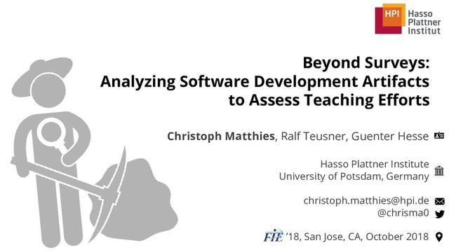 Slides of the talk on the paper "Beyond Surveys: Analyzing Software Development Artifacts to Assess Teaching Efforts" by Christoph Matthies, Ralf Teusner and Guenter Hesse given at the Frontiers in Education 2018 conference in San Jose, CA, USA in October 2018.