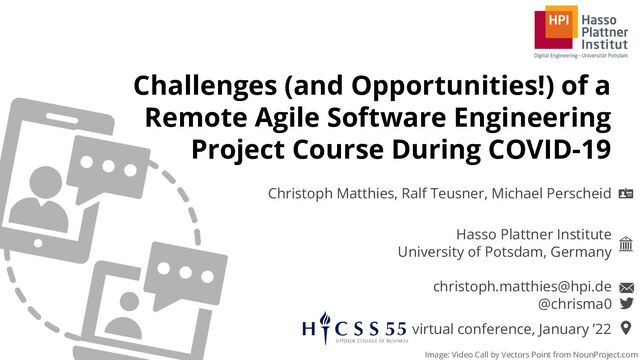Presentation slides of the paper "Challenges (and Opportunities!) of a Remote Agile Software Engineering Project Course During COVID-19", presented at the combined CSEE&T'22 and HICSS-55 SEET conference in January 2022.