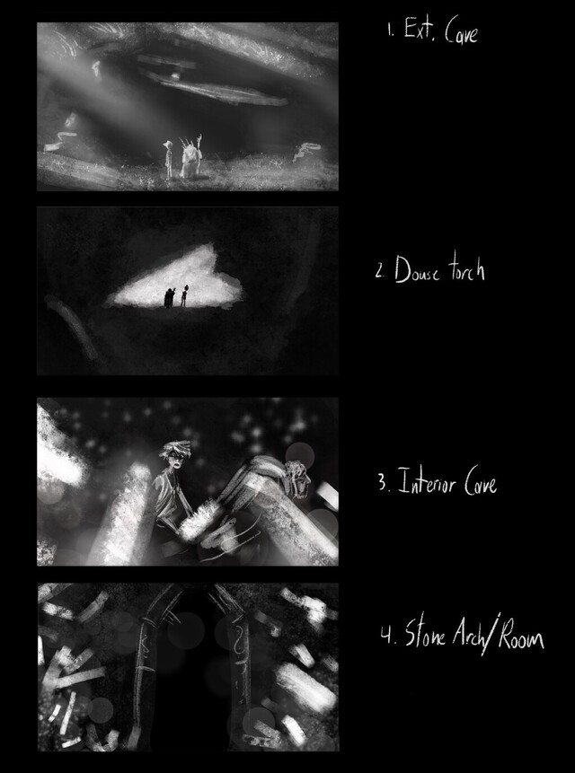 A few live-action beat-boards on a project I was working on. What was fun about this project is that the director and I could constantly bounce ideas off of each other and try to figure out a visual language that felt interesting and unique. We really wanted to focus more on silhouettes and "wide-shots" with minimalistic environments that could be done a smaller budget.
