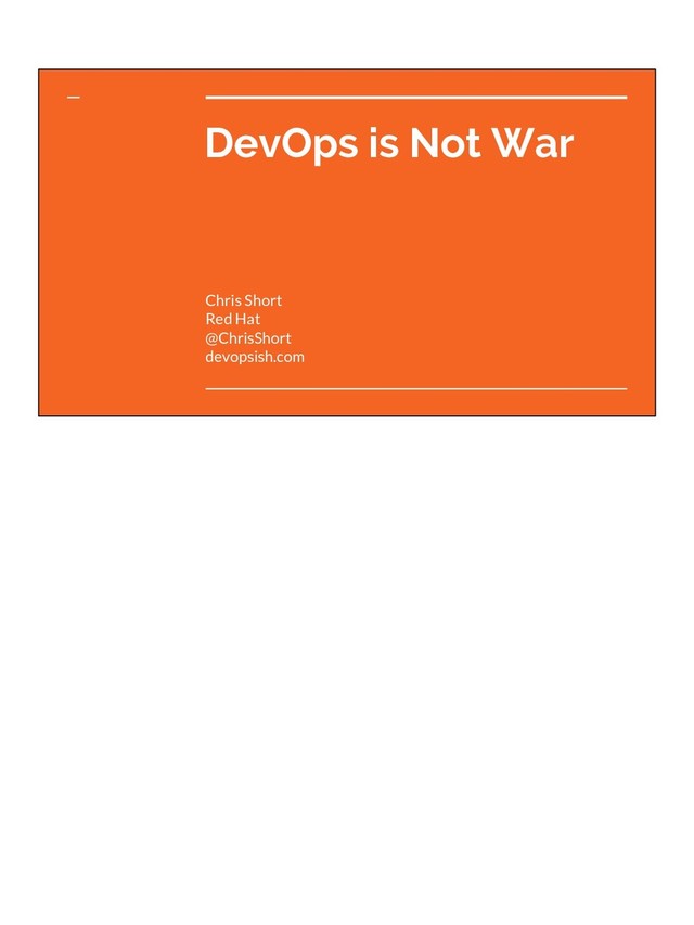 Research conducted by the Chris Short Academy of Pre-Talk Statistics Gathering (He Made it Up) @ChrisShort devopsish.com I want to be 100% clear DevOps is NOT War In general, do not use military tactics in your organizations Long term psychological damage these processes and policies cause They are inherently designed to do one thing; overcome an enemy For most people, no one dies if that prod deploy fails