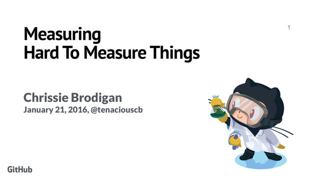 This talk covers some of the hard-to-measure things we're studying at GitHub. Stories include: cross-sectional survey project, pricing experiment with attitudinal data, and a Think Aloud with a research sneak attack.