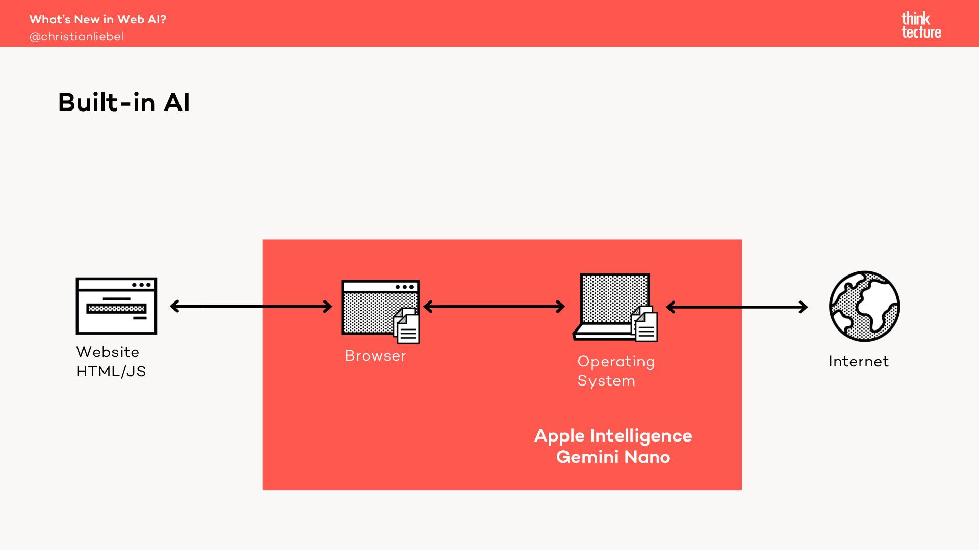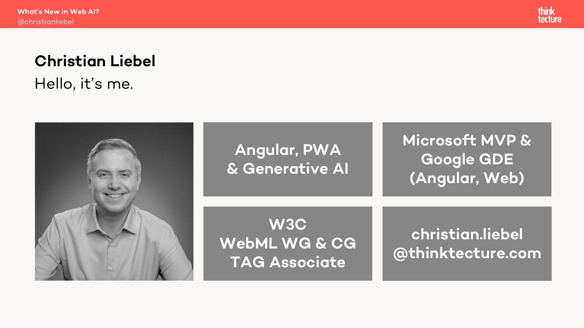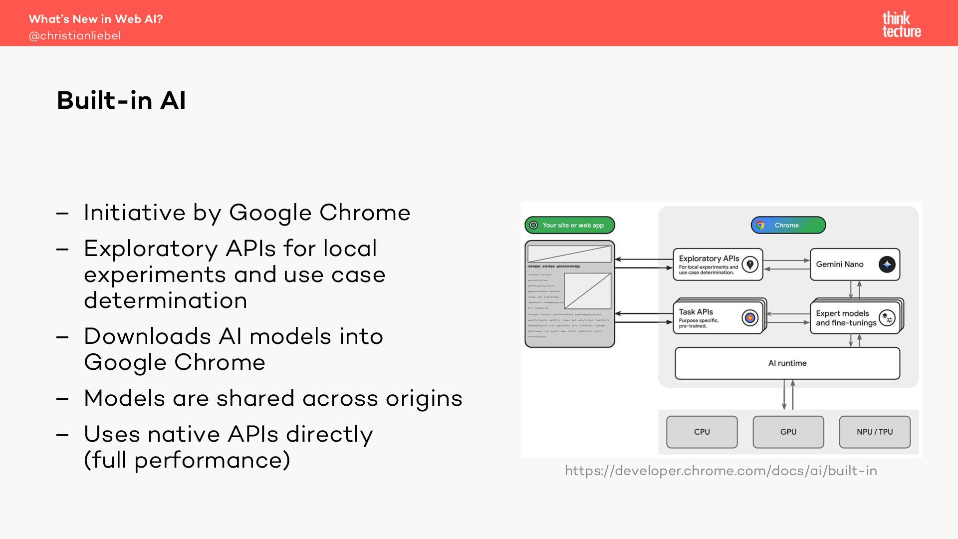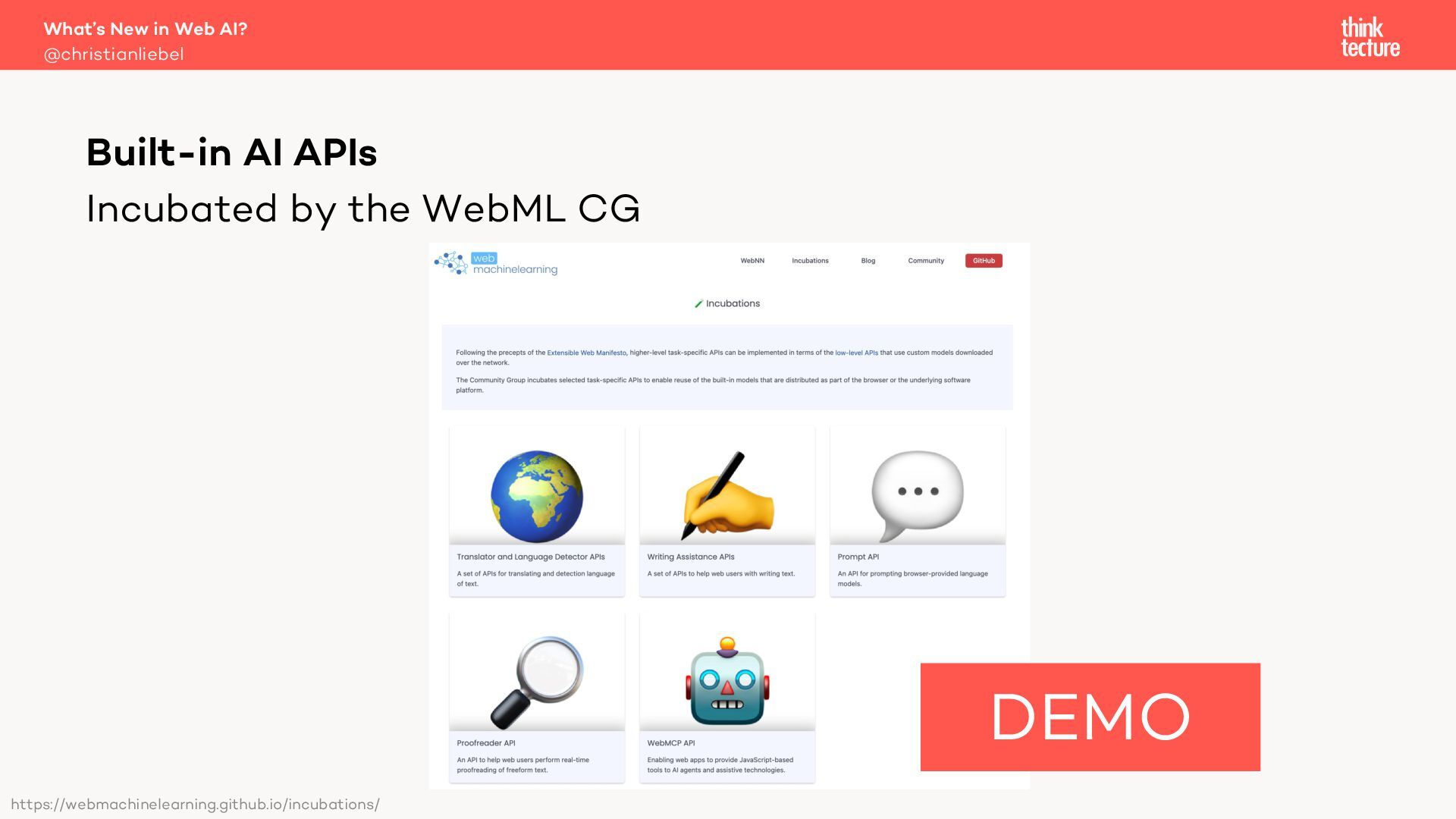 Generative AI is becoming a key part of modern software architecture, and its presence in web apps is growing. As demand increases, vendors and specification authors are working to make AI capabilities more accessible and integrated into the web platform. In this session, Christian Liebel—W3C TAG Associate and member of the WebML Working Group—will share what's cooking behind the scenes in Web AI. You'll get an update on the latest advancements in the WebNN API, Chromium's Built-in AI APIs, emerging developer tools, and the real-world challenges that browser vendors and standards authors are navigating to bring AI to the web.