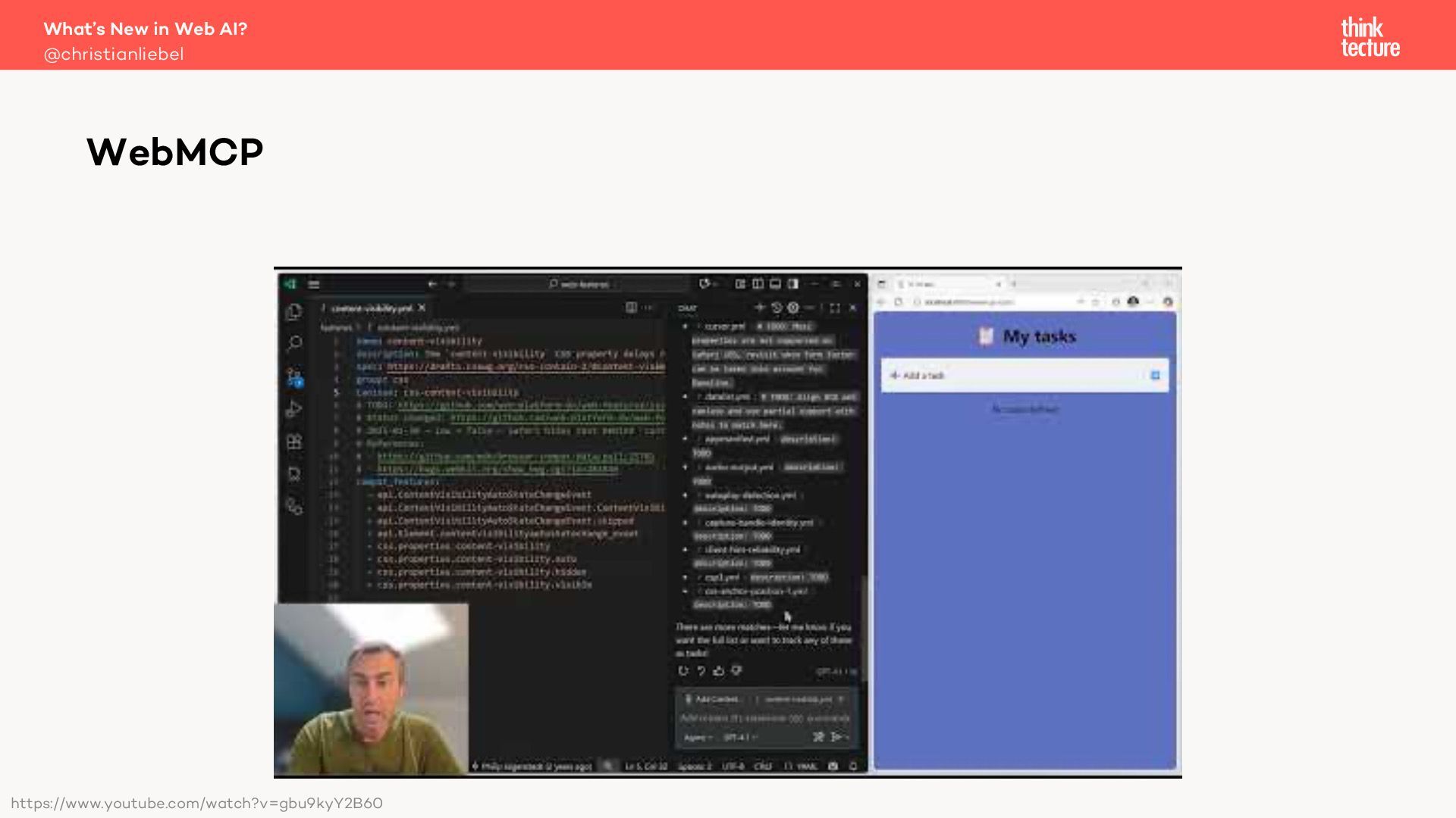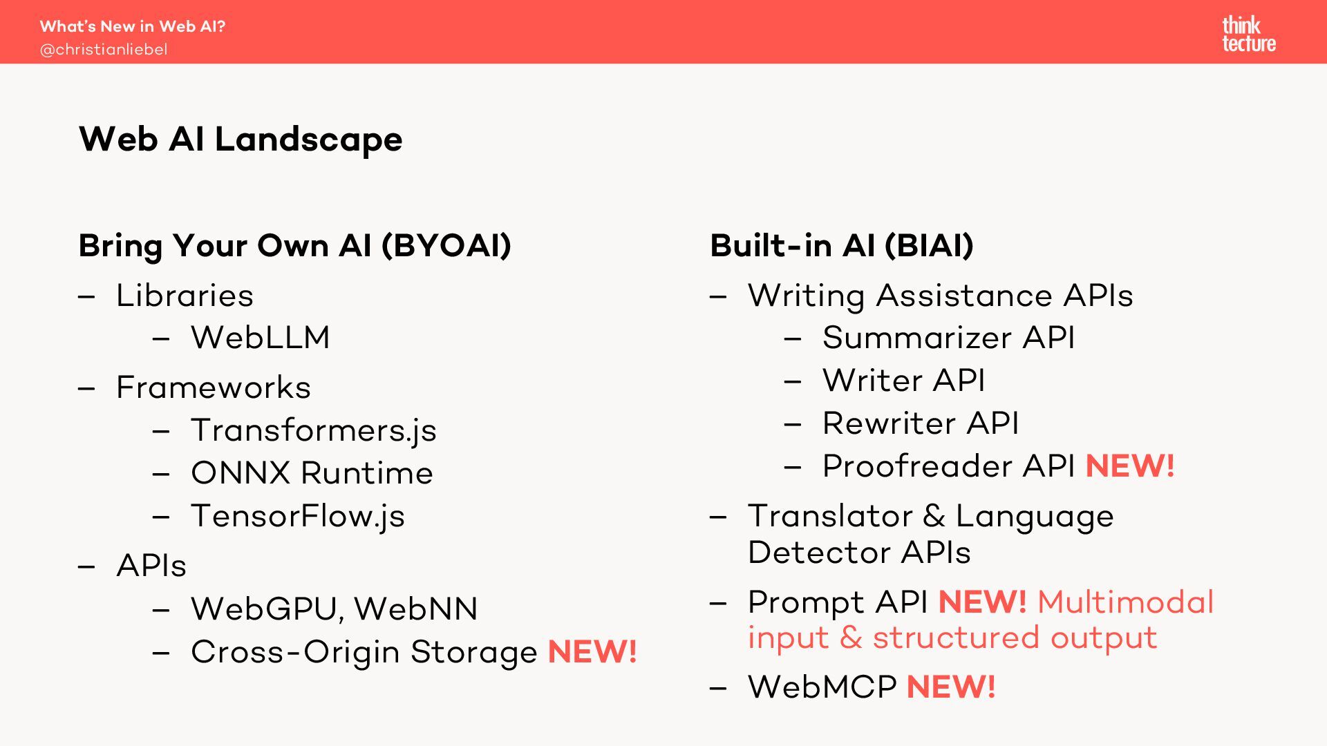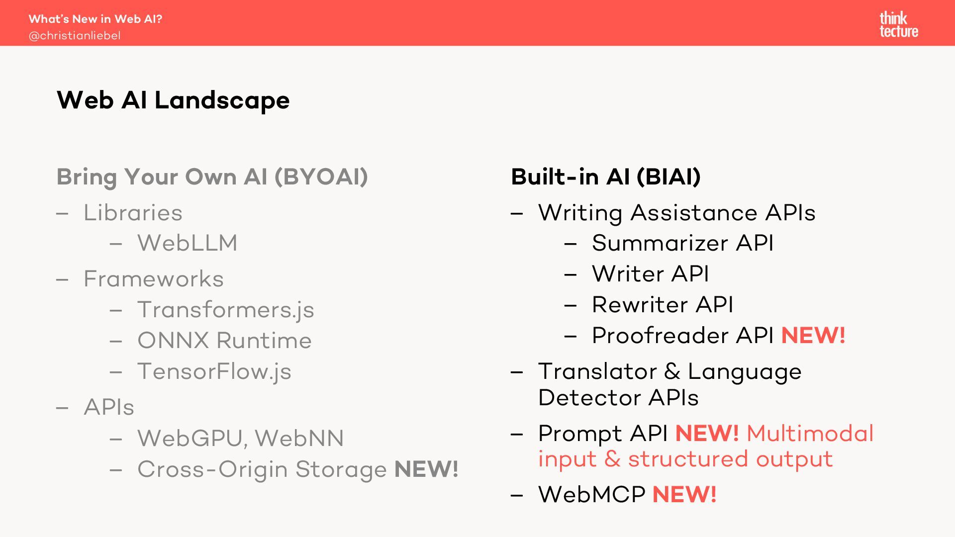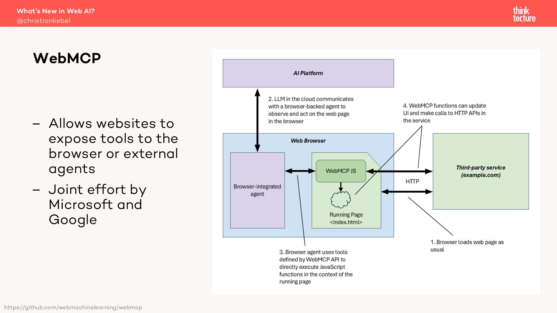 Generative AI is becoming a key part of modern software architecture, and its presence in web apps is growing. As demand increases, vendors and specification authors are working to make AI capabilities more accessible and integrated into the web platform. In this session, Christian Liebel—W3C TAG Associate and member of the WebML Working Group—will share what's cooking behind the scenes in Web AI. You'll get an update on the latest advancements in the WebNN API, Chromium's Built-in AI APIs, emerging developer tools, and the real-world challenges that browser vendors and standards authors are navigating to bring AI to the web.