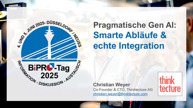In diesem Vortrag zeigt Christian Weyer anhand pragmatischer Muster, wie Small & Large Language Models und andere AI-Komponenten sinnvoll zusammenarbeiten können: für smarte Suchen, clevere Entscheidungen und strukturierte Ergebnisse. Statt Hype und Bauchgefühl gibt es hier konkrete Ansätze, wie Gen AI sicher und transparent in bestehende Anwendungen und Geschäftslogik integriert werden kann – live und hands-on.