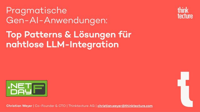 Generative Al jenseits des Buzzword-Bingos. In diesem Vortrag präsentiert Christian Weyer konkrete Patterns & Lösungen für die Integration von Large Language Models (LLMs) wie GPT, Mistral, Claude oder Llama in eigene Software-Architekturen.