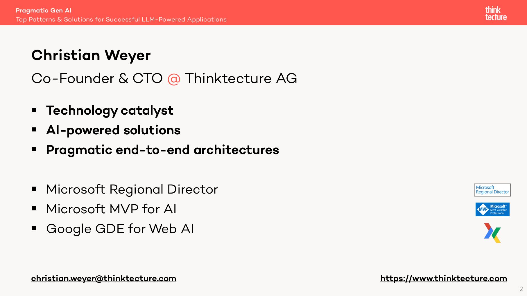 Generative AI and human language as first-class assets in your software—moving beyond buzzword bingo. Join Christian Weyer in this session to explore actionable patterns and solutions for seamlessly integrating language and embedding models into modern software architectures. Key topics, including Semantic Routing, Retrieval-Augmented Generation (RAG), Structured Output, and Observability, are demonstrated through harmonized, real-world examples in an end-to-end system featuring multiple services and client applications. Developers and architects will gain practical insights into bringing natural language user interfaces to life in their projects.