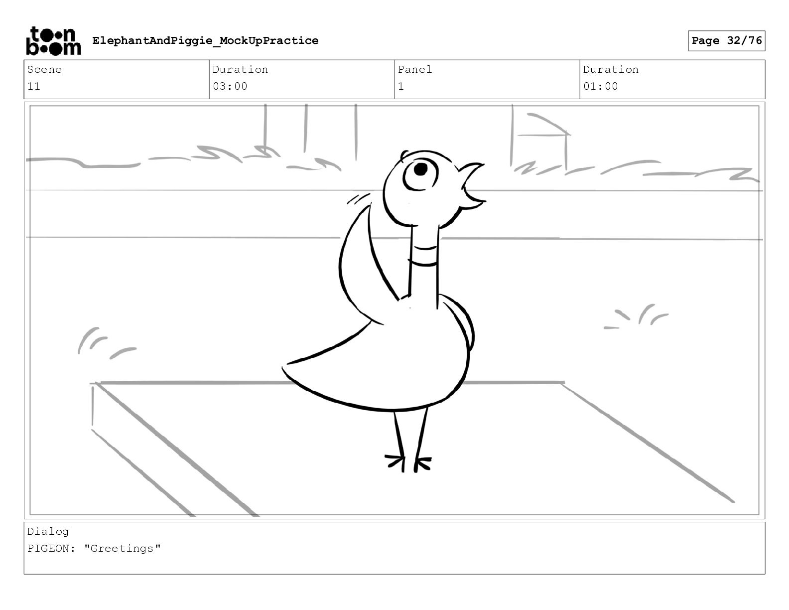 Scene 11 Duration 03:00 Panel 1 Duration 01:00 Dialog PIGEON:
