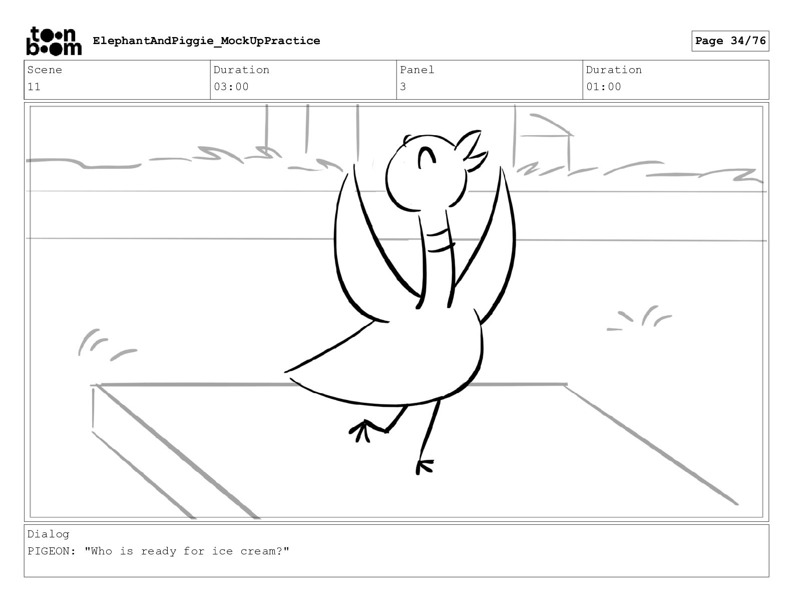 Scene 11 Duration 03:00 Panel 3 Duration 01:00 Dialog PIGEON: