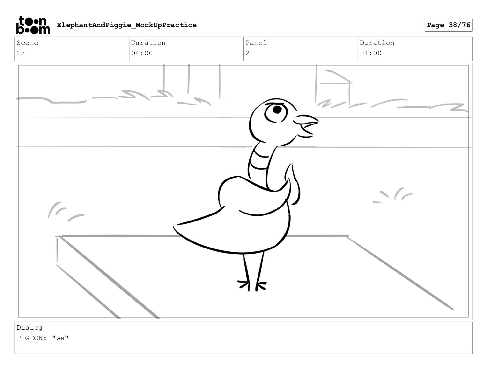 Scene 13 Duration 04:00 Panel 2 Duration 01:00 Dialog PIGEON: