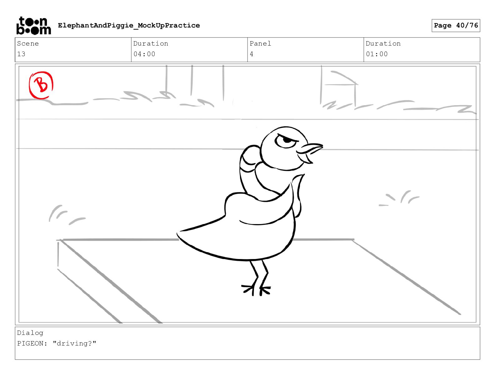 Scene 13 Duration 04:00 Panel 1 Duration 01:00 Dialog PIGEON: