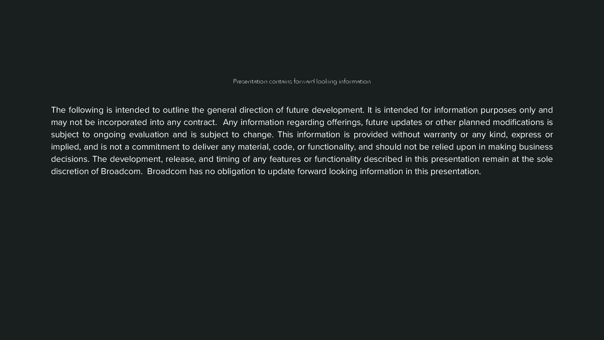 future development. It is intended for information purposes only and may not be incorporated into any contract. Any information regarding offerings, future updates or other planned modifications is subject to ongoing evaluation and is subject to change. This information is provided without warranty or any kind, express or implied, and is not a commitment to deliver any material, code, or functionality, and should not be relied upon in making business decisions. The development, release, and timing of any features or functionality described in this presentation remain at the sole discretion of Broadcom. Broadcom has no obligation to update forward looking information in this presentation. Presentation contains forward looking information