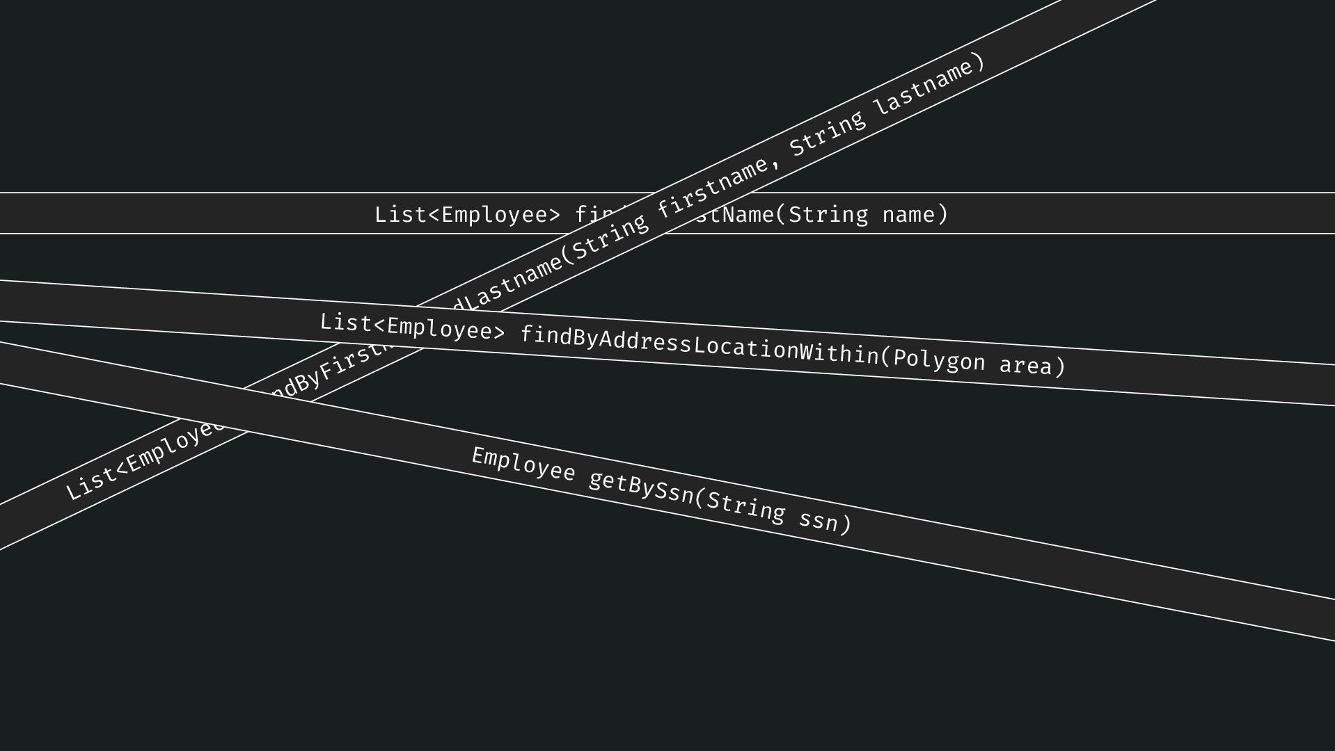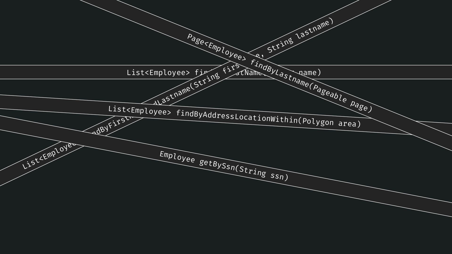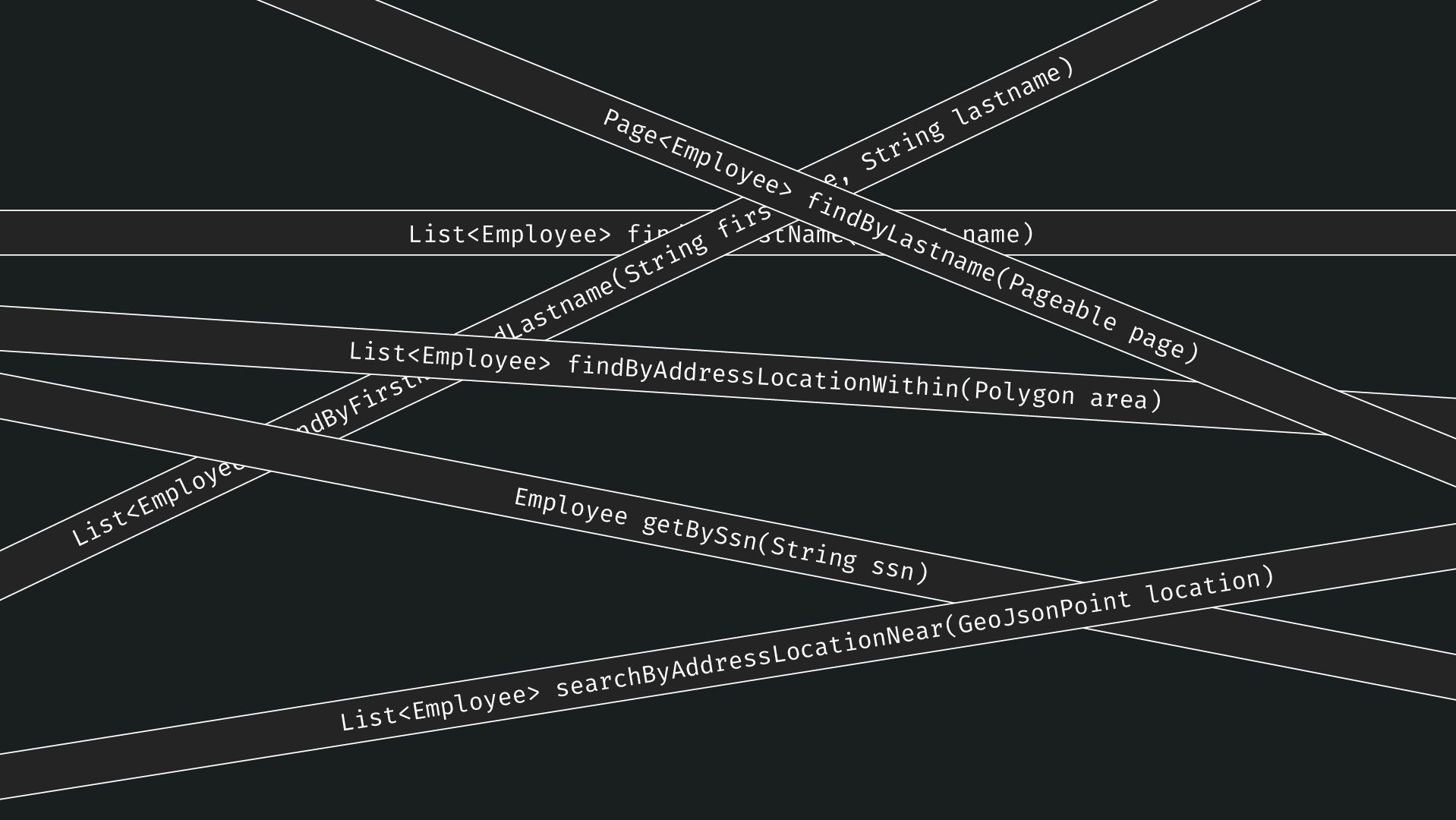 i rstname, String lastname) Employee getBySsn(String ssn) List<Employee> f i ndByAddressLocationWithin(Polygon area) Page<Employee> f i ndByLastname(Pageable page)
