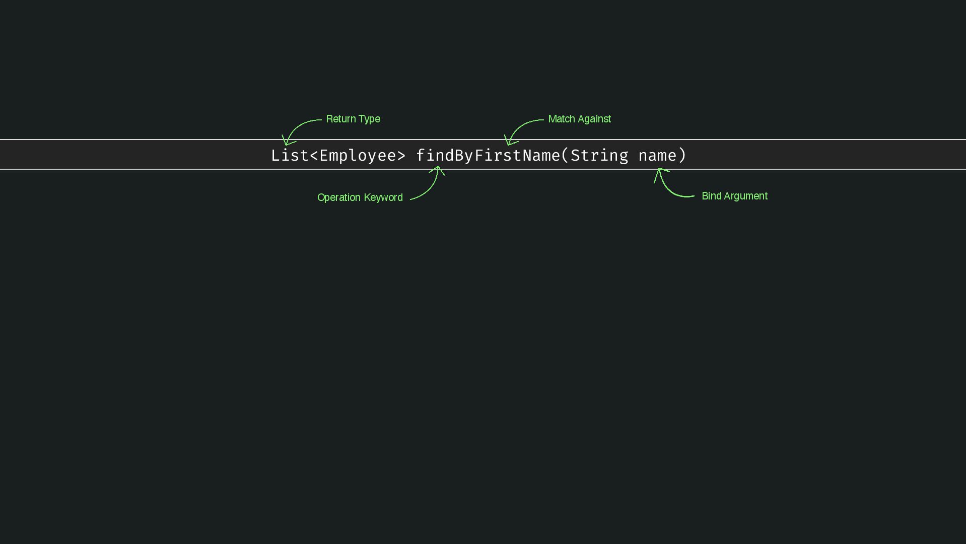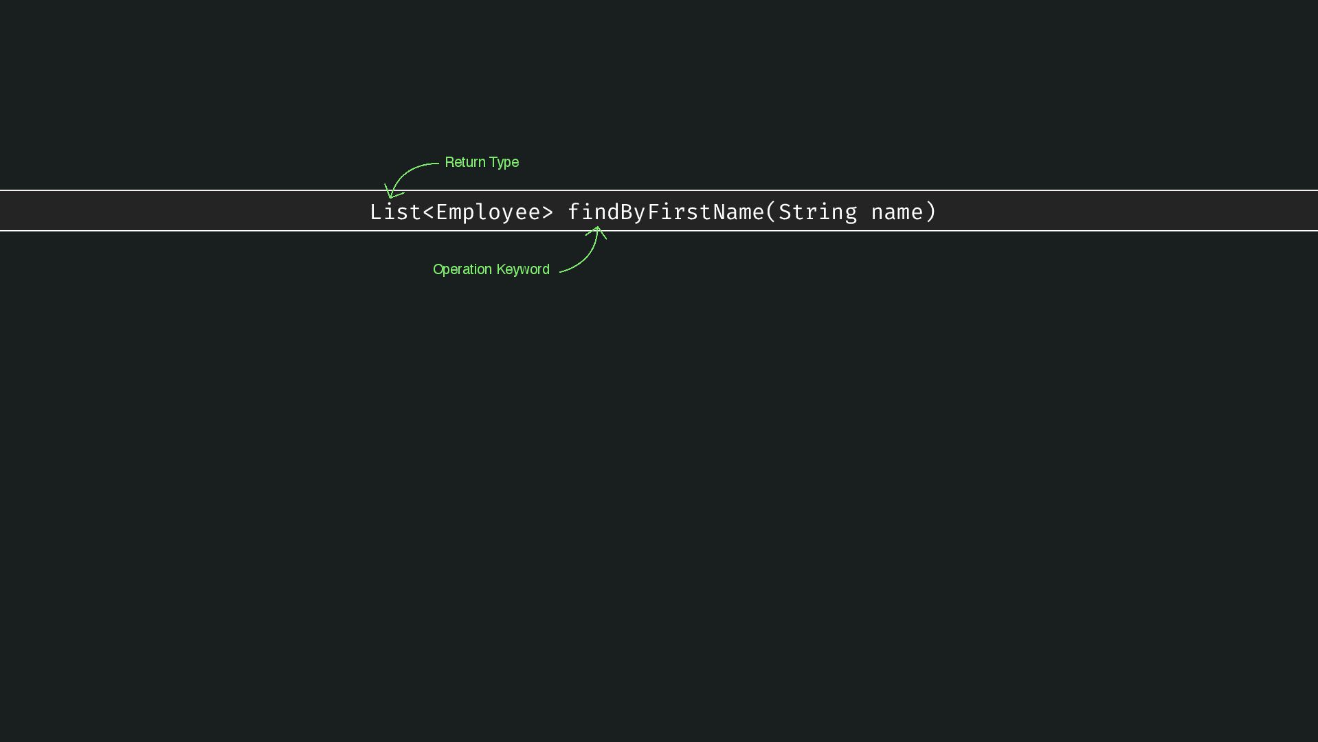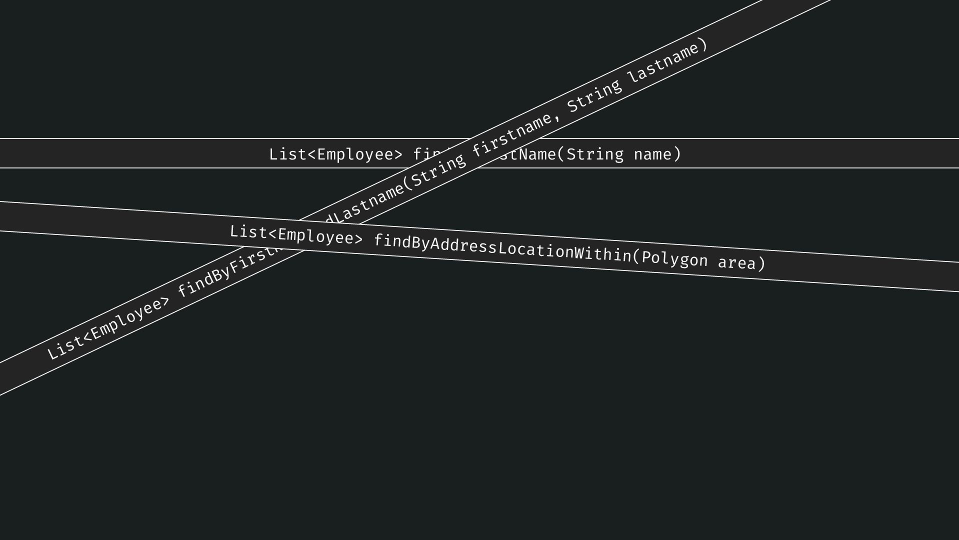 i rstname, String lastname) Employee getBySsn(String ssn) List<Employee> f i ndByAddressLocationWithin(Polygon area) Page<Employee> f i ndByLastname(Pageable page)