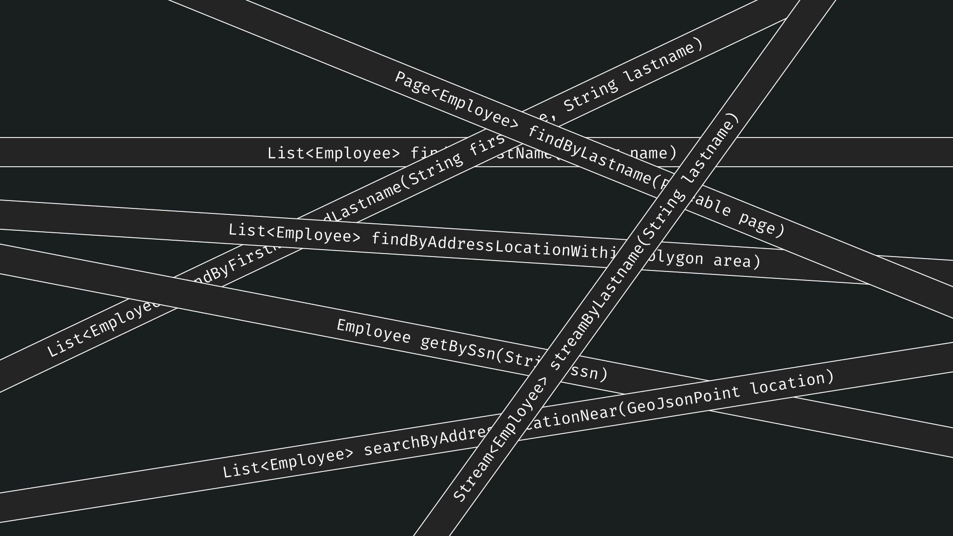 i rstname, String lastname) Employee getBySsn(String ssn) List<Employee> searchByAddressLocationNear(GeoJsonPoint location) List<Employee> f i ndByAddressLocationWithin(Polygon area) Page<Employee> f i ndByLastname(Pageable page) Stream<Employee> streamByLastname(String lastname)