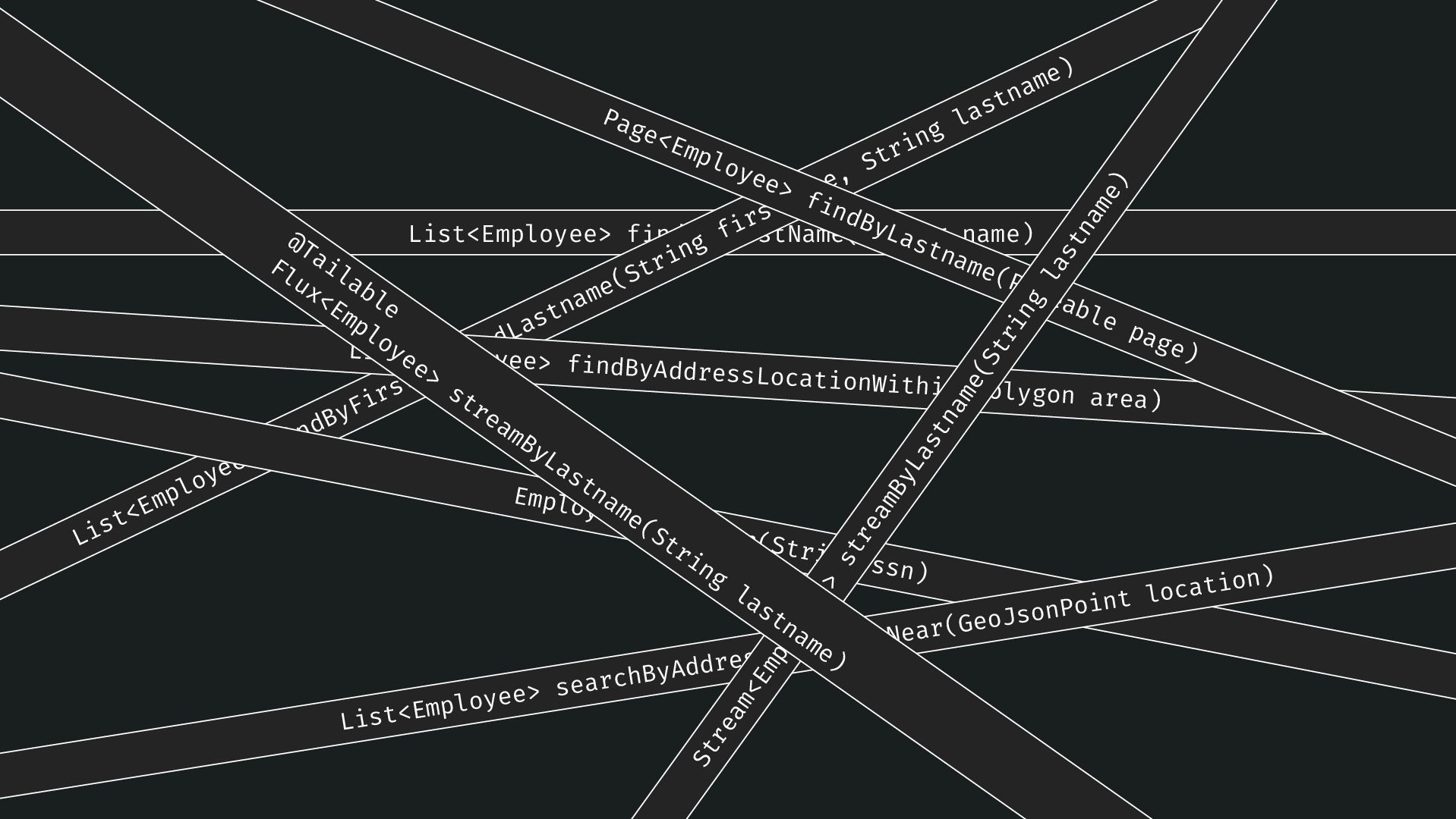 i rstname, String lastname) Employee getBySsn(String ssn) List<Employee> searchByAddressLocationNear(GeoJsonPoint location) List<Employee> f i ndByAddressLocationWithin(Polygon area) Page<Employee> f i ndByLastname(Pageable page) Stream<Employee> streamByLastname(String lastname) @Tailable F l ux<Employee> streamByLastname(String lastname)