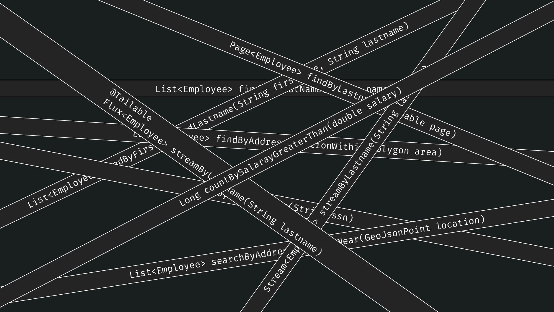 i rstname, String lastname) Employee getBySsn(String ssn) List<Employee> searchByAddressLocationNear(GeoJsonPoint location) List<Employee> f i ndByAddressLocationWithin(Polygon area) Page<Employee> f i ndByLastname(Pageable page) Stream<Employee> streamByLastname(String lastname) @Tailable F l ux<Employee> streamByLastname(String lastname) Long countBySalarayGreaterThan(double salary)