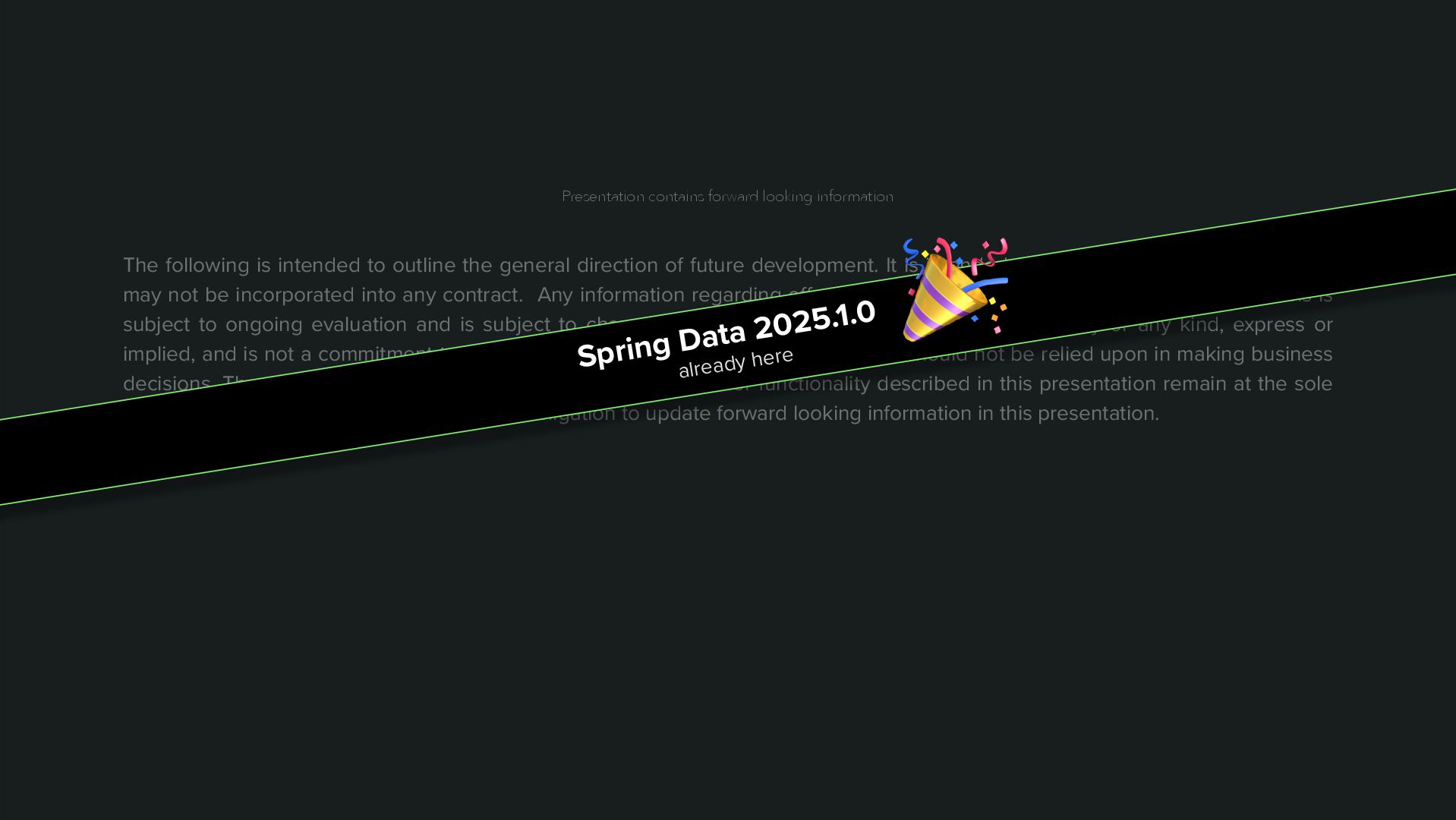 future development. It is intended for information purposes only and may not be incorporated into any contract. Any information regarding offerings, future updates or other planned modifications is subject to ongoing evaluation and is subject to change. This information is provided without warranty or any kind, express or implied, and is not a commitment to deliver any material, code, or functionality, and should not be relied upon in making business decisions. The development, release, and timing of any features or functionality described in this presentation remain at the sole discretion of Broadcom. Broadcom has no obligation to update forward looking information in this presentation. Presentation contains forward looking information Spring Data 2025.1.0 already here 🎉