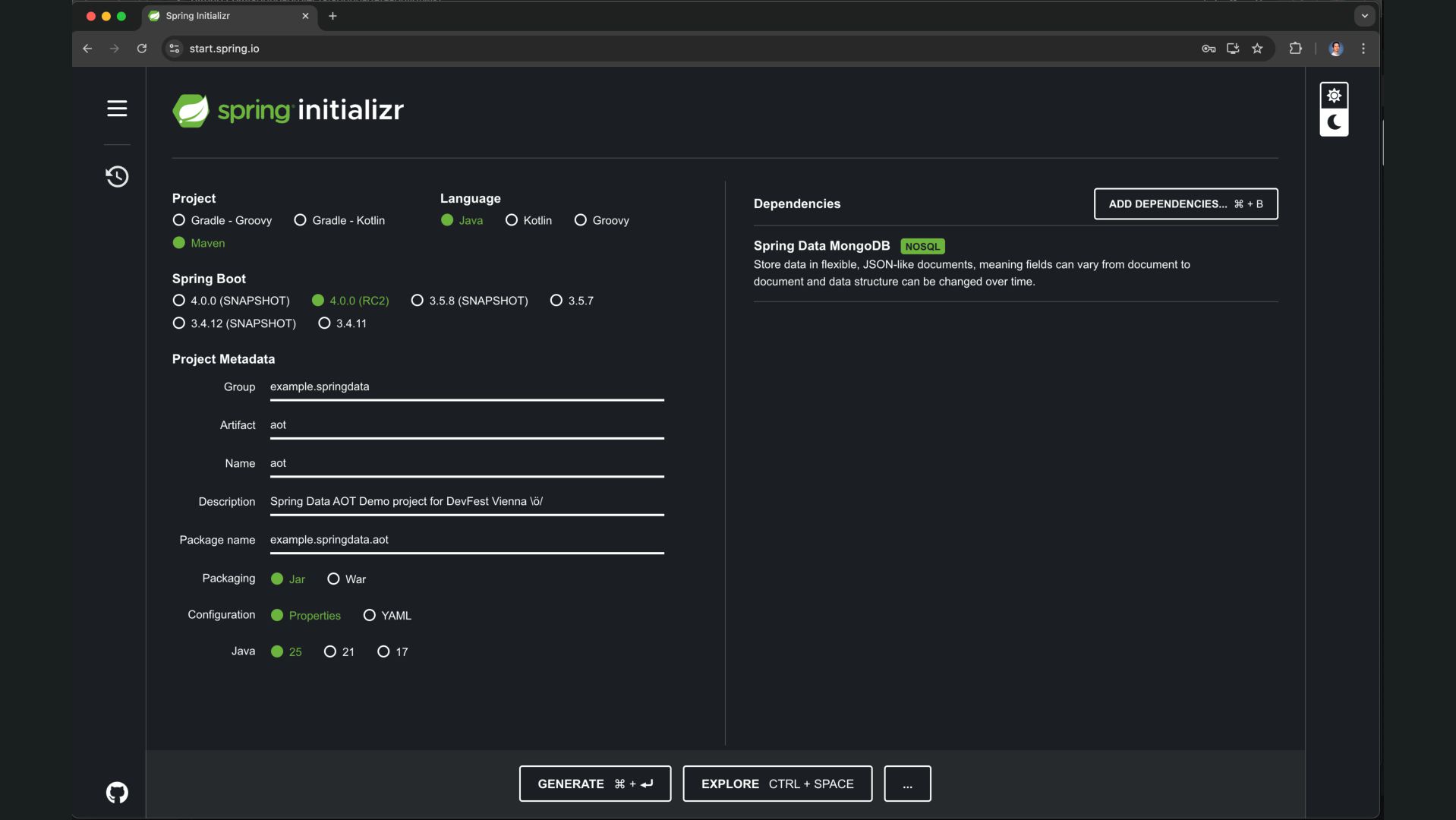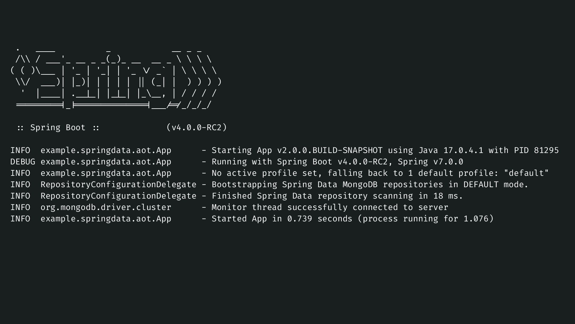 /\\ / _ _ _ '_ _ _ _ _(_)_ _ _ _ _ _ \ \ \ \ ( ( )\ _ _ _ | '_ | '_| | '_ \ / _` | \ \ \ \ \\/ _ _ _ )| |_)| | | | | | | (_| | ) ) ) ) ' | _ _ _ _ | . _ _ | _ | | _ | _ | |_\ _ _ , | / / / / = = = = = = = = = | _ | = = = = = = = = = = = = = = | _ _ _ / = / _/_/_/ : : Spring Boot : : (v4.0.0-RC2) INFO example.springdata.aot.App - Starting AOT-processed App v2.0.0.BUILD-SNAPSHOT using Java 25 DEBUG example.springdata.aot.App - Running with Spring Boot v4.0.0-RC2, Spring v7.0.0 INFO example.springdata.aot.App - No active prof i le set, falling back to 1 default prof i le: "default" INFO RepositoryConf i gurationDelegate - Bootstrapping Spring Data MongoDB repositories in DEFAULT mode. INFO org.mongodb.driver.cluster - Monitor thread successfully connected to server INFO example.springdata.aot.App - Started App in 0.177 seconds (process running for 0.436) faster startup