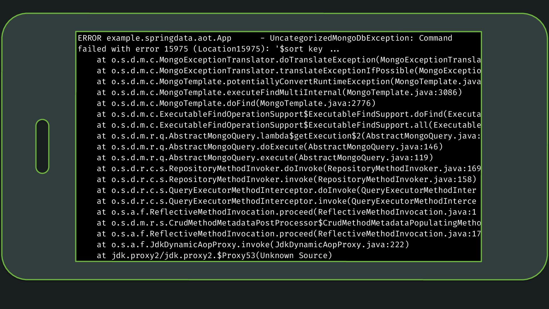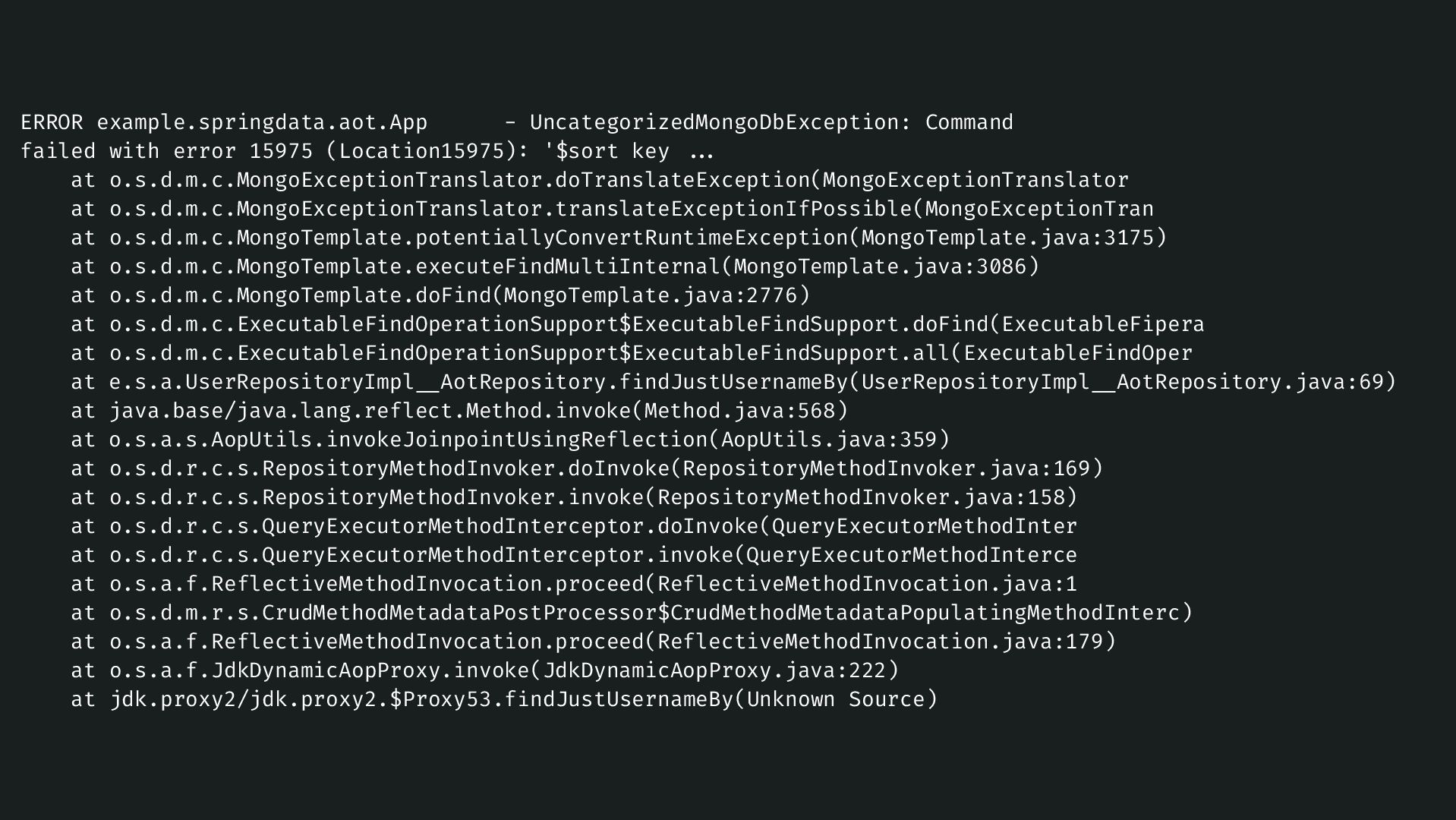 : '$sort key . . . at o.s.d.m.c.MongoExceptionTranslator.doTranslateException(MongoExceptionTranslator at o.s.d.m.c.MongoExceptionTranslator.translateExceptionIfPossible(MongoExceptionTran at o.s.d.m.c.MongoTemplate.potentiallyConvertRuntimeException(MongoTemplate.java:3175) at o.s.d.m.c.MongoTemplate.executeFindMultiInternal(MongoTemplate.java:3086) at o.s.d.m.c.MongoTemplate.doFind(MongoTemplate.java:2776) at o.s.d.m.c.ExecutableFindOperationSupport$ExecutableFindSupport.doFind(ExecutableFipera at o.s.d.m.c.ExecutableFindOperationSupport$ExecutableFindSupport.all(ExecutableFindOper at o.s.d.r.c.s.RepositoryMethodInvoker.doInvoke(RepositoryMethodInvoker.java:169) at o.s.d.r.c.s.RepositoryMethodInvoker.invoke(RepositoryMethodInvoker.java:158) at o.s.d.r.c.s.QueryExecutorMethodInterceptor.doInvoke(QueryExecutorMethodInter at o.s.d.r.c.s.QueryExecutorMethodInterceptor.invoke(QueryExecutorMethodInterce at o.s.a.f.ReflectiveMethodInvocation.proceed(ReflectiveMethodInvocation.java:1 at o.s.d.m.r.s.CrudMethodMetadataPostProcessor$CrudMethodMetadataPopulatingMethodInterc) at o.s.a.f.ReflectiveMethodInvocation.proceed(ReflectiveMethodInvocation.java:179) at o.s.a.f.JdkDynamicAopProxy.invoke(JdkDynamicAopProxy.java:222) at jdk.proxy2/jdk.proxy2.$Proxy53.f i ndJustUsernameBy(Unknown Source) at e.s.a.UserRepositoryImpl _ _ AotRepository.f i ndJustUsernameBy(UserRepositoryImpl _ _ AotRepository.java:69) at java.base/java.lang.reflect.Method.invoke(Method.java:568) at o.s.a.s.AopUtils.invokeJoinpointUsingReflection(AopUtils.java:359) navigable & debuggable