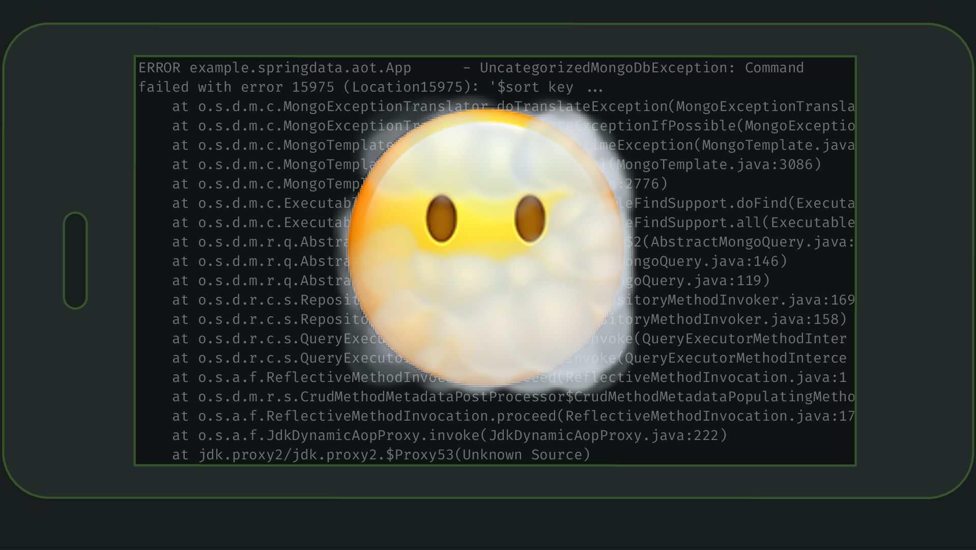 : '$sort key . . . at o.s.d.m.c.MongoExceptionTranslator.doTranslateException(MongoExceptionTranslator at o.s.d.m.c.MongoExceptionTranslator.translateExceptionIfPossible(MongoExceptionTran at o.s.d.m.c.MongoTemplate.potentiallyConvertRuntimeException(MongoTemplate.java:3175) at o.s.d.m.c.MongoTemplate.executeFindMultiInternal(MongoTemplate.java:3086) at o.s.d.m.c.MongoTemplate.doFind(MongoTemplate.java:2776) at o.s.d.m.c.ExecutableFindOperationSupport$ExecutableFindSupport.doFind(ExecutableFipera at o.s.d.m.c.ExecutableFindOperationSupport$ExecutableFindSupport.all(ExecutableFindOper at o.s.d.m.r.q.AbstractMongoQuery.lambda$getExecution$2(AbstractMongoQuery.java:190) at o.s.d.m.r.q.AbstractMongoQuery.doExecute(AbstractMongoQuery.java:146) at o.s.d.m.r.q.AbstractMongoQuery.execute(AbstractMongoQuery.java:119) at o.s.d.r.c.s.RepositoryMethodInvoker.doInvoke(RepositoryMethodInvoker.java:169) at o.s.d.r.c.s.RepositoryMethodInvoker.invoke(RepositoryMethodInvoker.java:158) at o.s.d.r.c.s.QueryExecutorMethodInterceptor.doInvoke(QueryExecutorMethodInter at o.s.d.r.c.s.QueryExecutorMethodInterceptor.invoke(QueryExecutorMethodInterce at o.s.a.f.ReflectiveMethodInvocation.proceed(ReflectiveMethodInvocation.java:1 at at o.s.d.m.r.s.CrudMethodMetadataPostProcessor$CrudMethodMetadataPopulatingMethodInterc) at o.s.a.f.ReflectiveMethodInvocation.proceed(ReflectiveMethodInvocation.java:179) at o.s.a.f.JdkDynamicAopProxy.invoke(JdkDynamicAopProxy.java:222) at jdk.proxy2/jdk.proxy2.$Proxy53(Unknown Source) 😶🌫