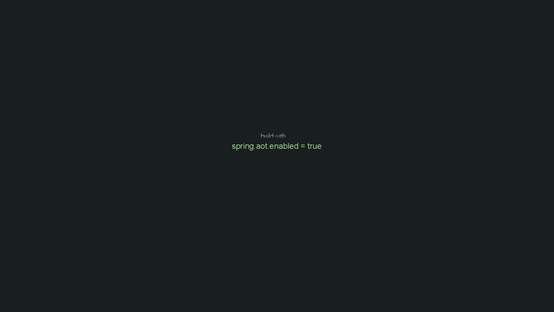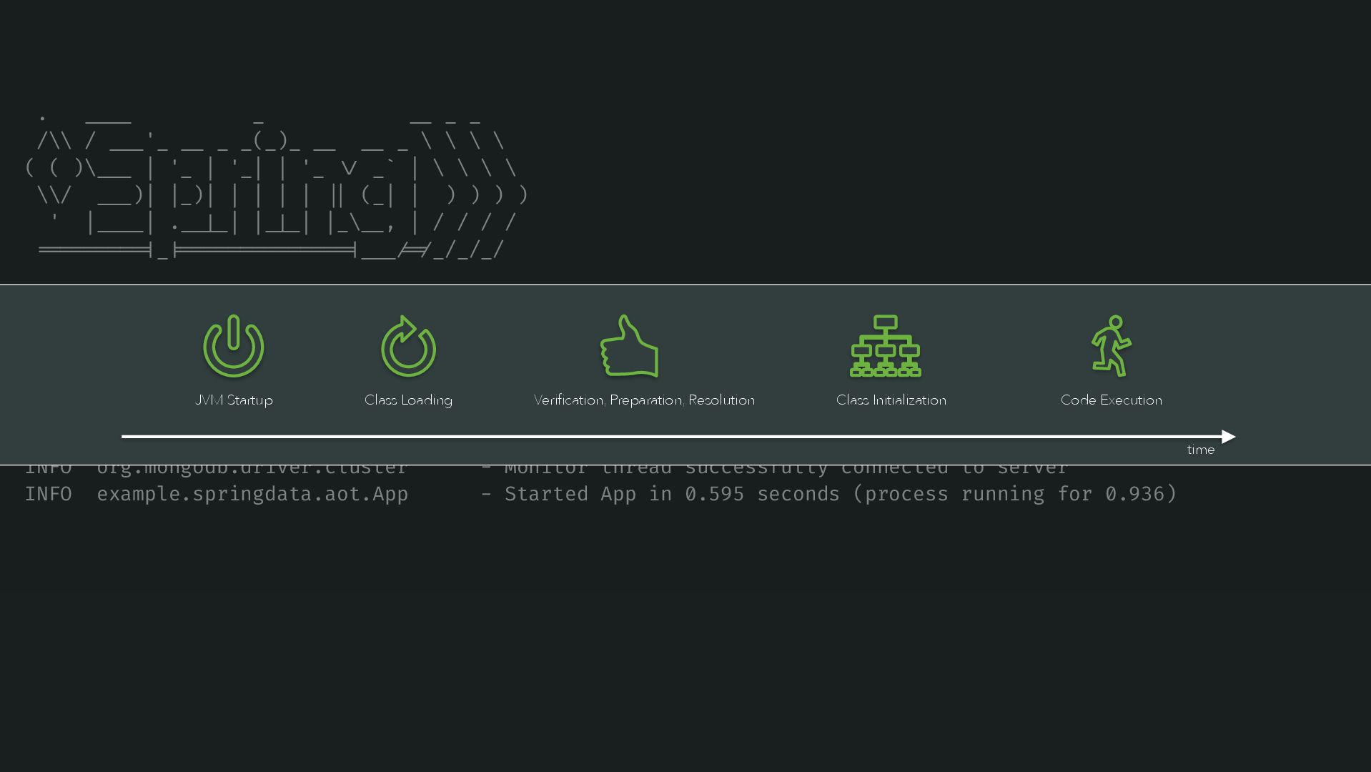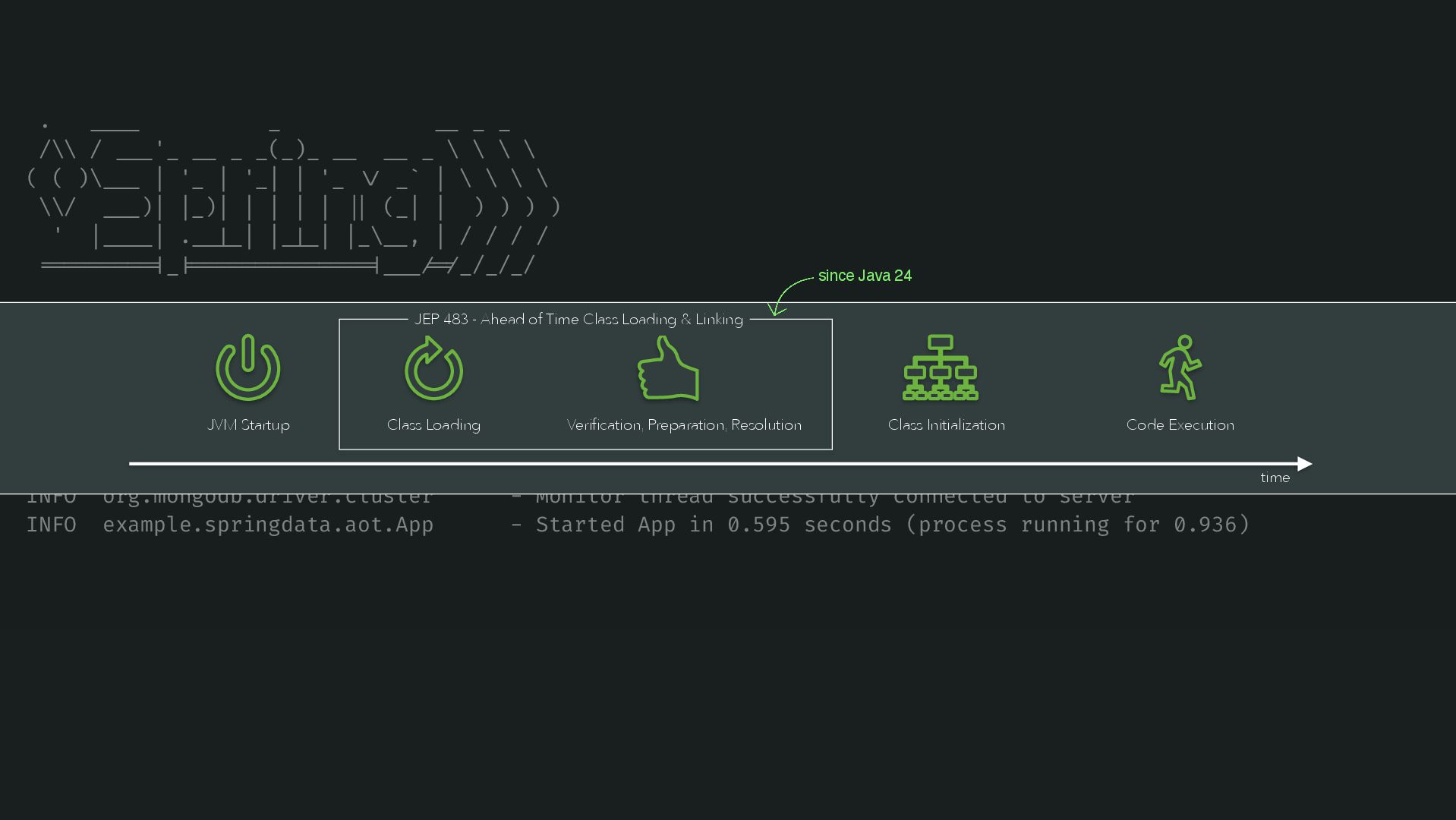 /\\ / _ _ _ '_ _ _ _ _(_)_ _ _ _ _ _ \ \ \ \ ( ( )\ _ _ _ | '_ | '_| | '_ \ / _` | \ \ \ \ \\/ _ _ _ )| |_)| | | | | | | (_| | ) ) ) ) ' | _ _ _ _ | . _ _ | _ | | _ | _ | |_\ _ _ , | / / / / = = = = = = = = = | _ | = = = = = = = = = = = = = = | _ _ _ / = / _/_/_/ : : Spring Boot : : (v4.0.0-M2) INFO example.springdata.aot.App - Starting AOT-processed App v2.0.0.BUILD-SNAPSHOT using Java 17.0.4.1 DEBUG example.springdata.aot.App - Running with Spring Boot v4.0.0-M2, Spring v7.0.0-M8 INFO example.springdata.aot.App - No active prof i le set, falling back to 1 default prof i le: "default" INFO RepositoryConf i gurationDelegate - Bootstrapping Spring Data MongoDB repositories in DEFAULT mode. INFO org.mongodb.driver.cluster - Monitor thread successfully connected to server INFO example.springdata.aot.App - Started App in 0.595 seconds (process running for 0.936) JVM Startup Class Loading Verification, Preparation, Resolution Class Initialization Code Execution time JEP 483 - Ahead of Time Class Loading & Linking since Java 24