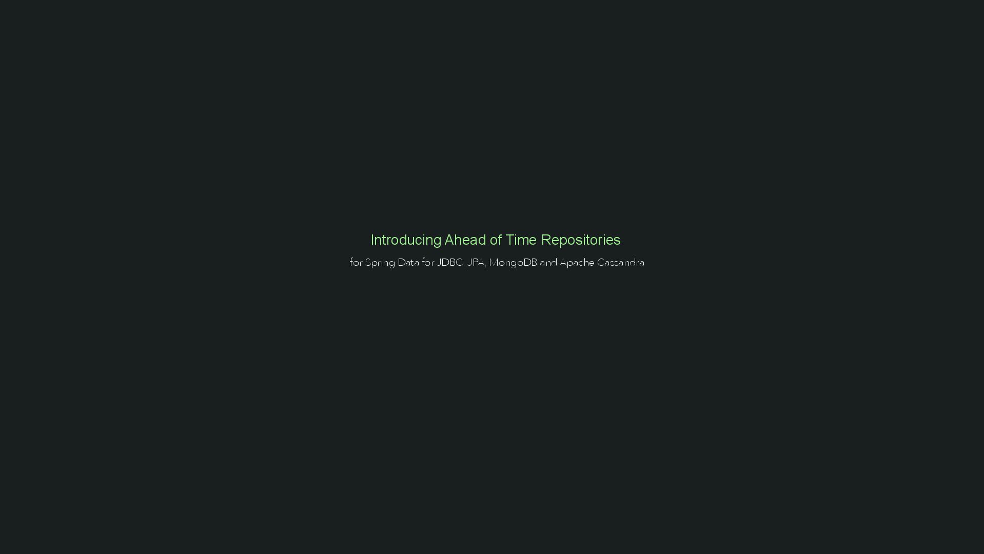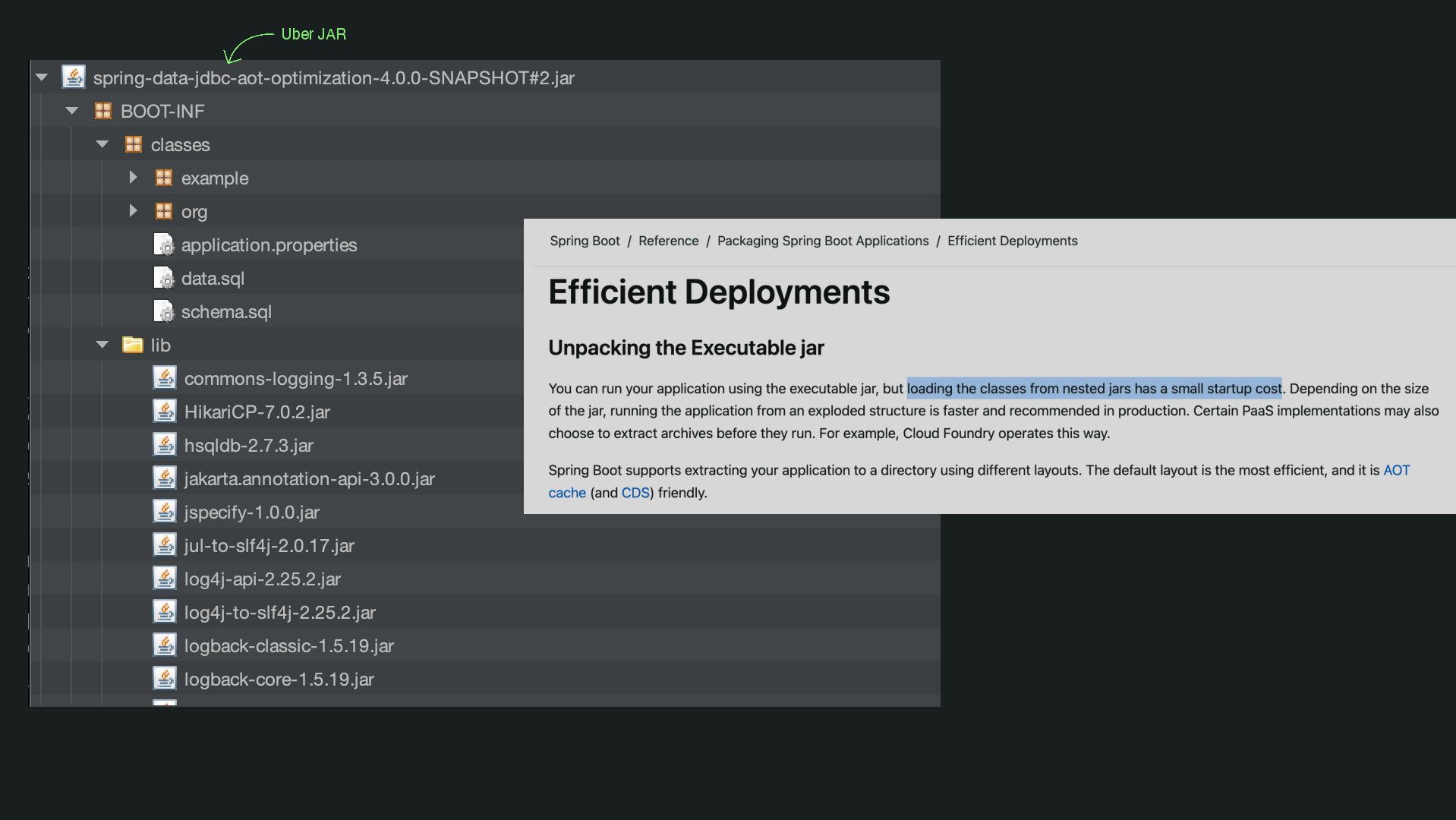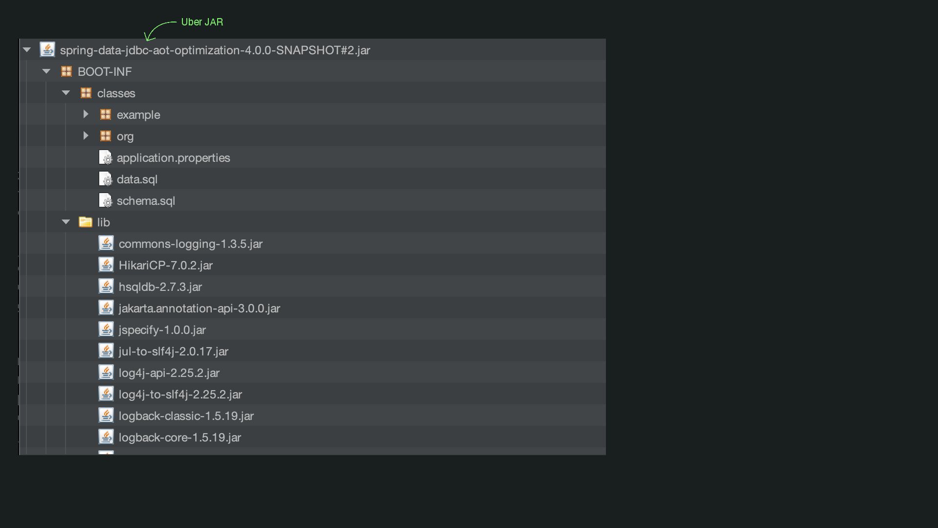 /\\ / _ _ _ '_ _ _ _ _(_)_ _ _ _ _ _ \ \ \ \ ( ( )\ _ _ _ | '_ | '_| | '_ \ / _` | \ \ \ \ \\/ _ _ _ )| |_)| | | | | | | (_| | ) ) ) ) ' | _ _ _ _ | . _ _ | _ | | _ | _ | |_\ _ _ , | / / / / = = = = = = = = = | _ | = = = = = = = = = = = = = = | _ _ _ / = / _/_/_/ : : Spring Boot : : (v4.0.0-M2) INFO example.springdata.aot.App - Starting AOT-processed App v2.0.0.BUILD-SNAPSHOT using Java 17.0.4.1 DEBUG example.springdata.aot.App - Running with Spring Boot v4.0.0-M2, Spring v7.0.0-M8 INFO example.springdata.aot.App - No active prof i le set, falling back to 1 default prof i le: "default" INFO RepositoryConf i gurationDelegate - Bootstrapping Spring Data MongoDB repositories in DEFAULT mode. INFO org.mongodb.driver.cluster - Monitor thread successfully connected to server INFO example.springdata.aot.App - Started App in 0.595 seconds (process running for 0.936) JVM Startup Class Loading Verification, Preparation, Resolution Class Initialization Code Execution time JEP 483 - Ahead of Time Class Loading & Linking since Java 24