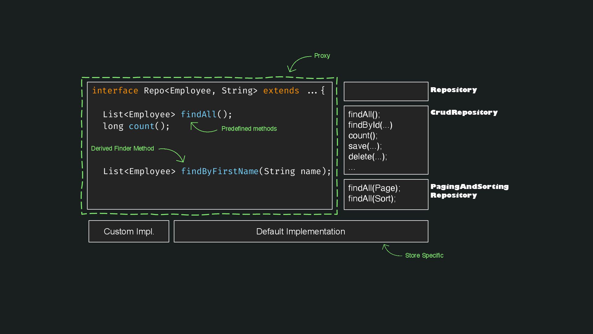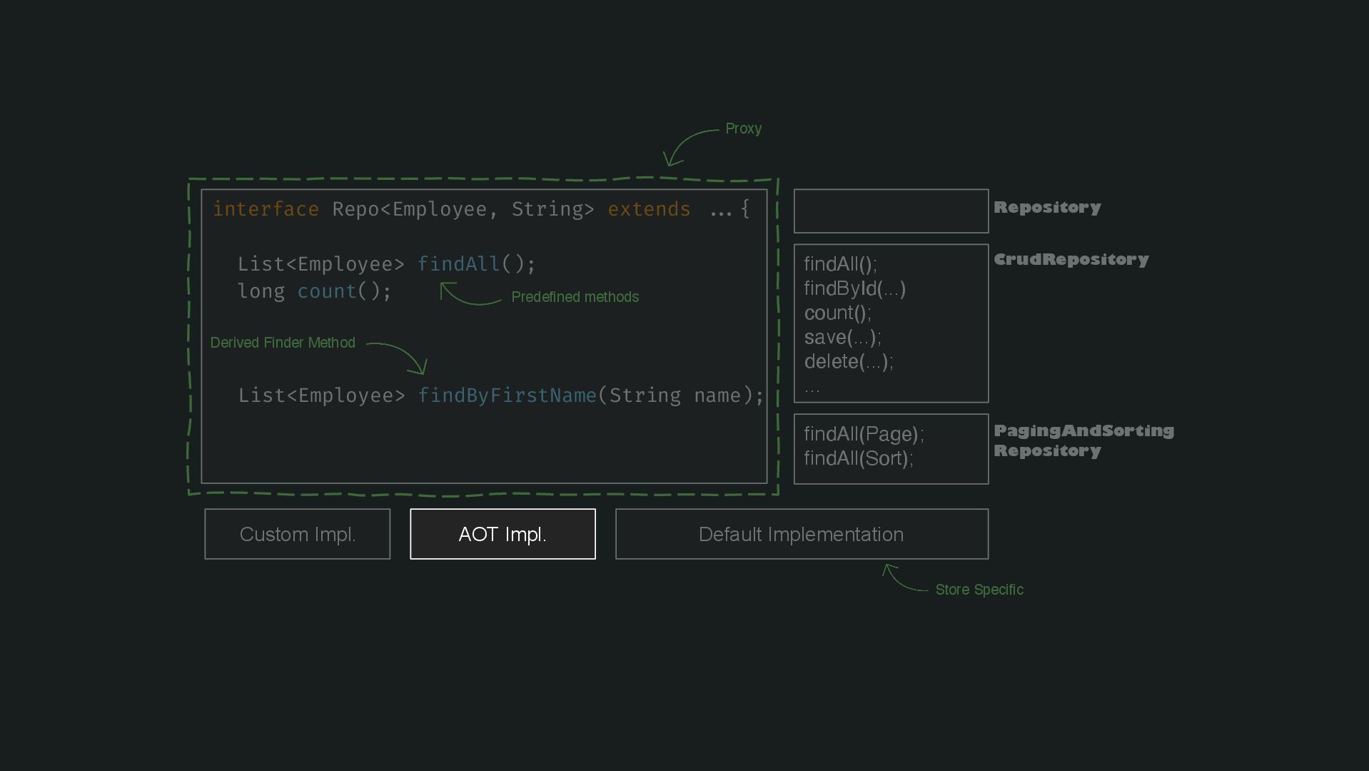 findAll(); findById(...) count(); save(...); delete(...); ... PagingAndSorting Repository findAll(Page); findAll(Sort); Proxy Default Implementation Store Specific List<Employee> f i ndAll(); long count(); Predefined methods List<Employee> f i ndByFirstName(String name); Derived Finder Method Custom Impl. AOT Impl.