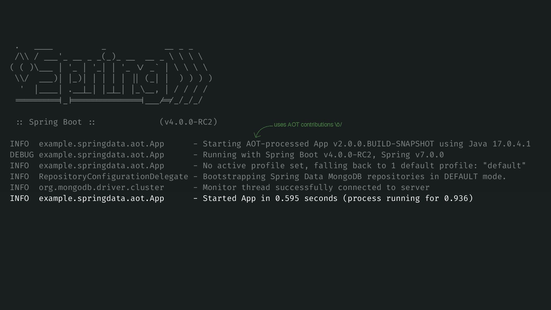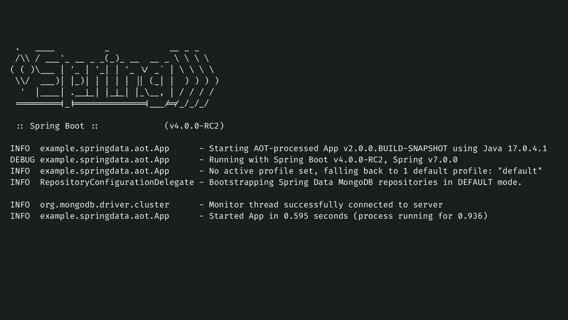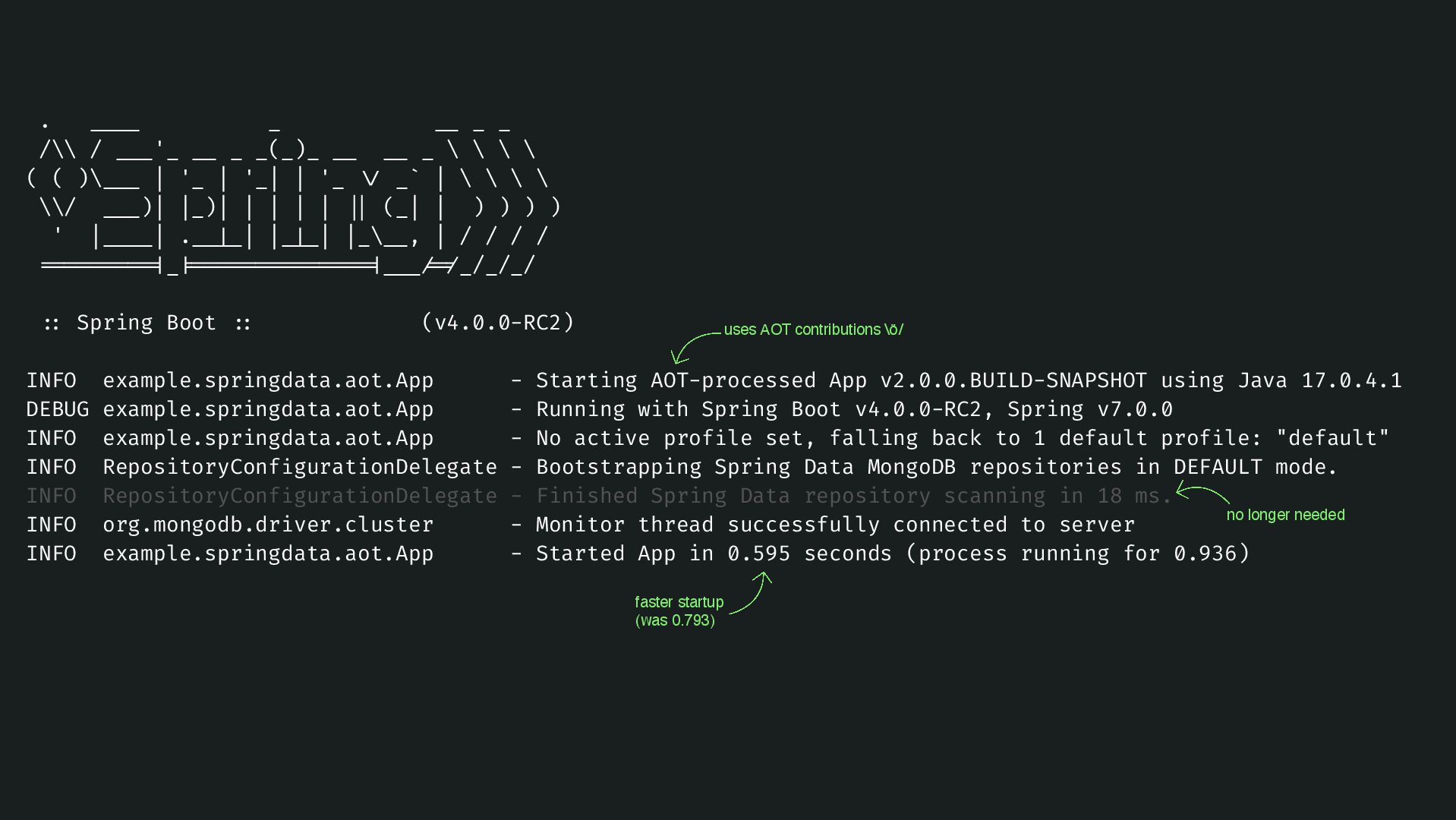 /\\ / _ _ _ '_ _ _ _ _(_)_ _ _ _ _ _ \ \ \ \ ( ( )\ _ _ _ | '_ | '_| | '_ \ / _` | \ \ \ \ \\/ _ _ _ )| |_)| | | | | | | (_| | ) ) ) ) ' | _ _ _ _ | . _ _ | _ | | _ | _ | |_\ _ _ , | / / / / = = = = = = = = = | _ | = = = = = = = = = = = = = = | _ _ _ / = / _/_/_/ : : Spring Boot : : (v4.0.0-RC2) INFO example.springdata.aot.App - Starting AOT-processed App v2.0.0.BUILD-SNAPSHOT using Java 17.0.4.1 DEBUG example.springdata.aot.App - Running with Spring Boot v4.0.0-RC2, Spring v7.0.0 INFO example.springdata.aot.App - No active prof i le set, falling back to 1 default prof i le: "default" INFO RepositoryConf i gurationDelegate - Bootstrapping Spring Data MongoDB repositories in DEFAULT mode. INFO RepositoryConf i gurationDelegate - Finished Spring Data repository scanning in 18 ms. INFO org.mongodb.driver.cluster - Monitor thread successfully connected to server INFO example.springdata.aot.App - Started App in 0.595 seconds (process running for 0.936) no longer needed faster startup
