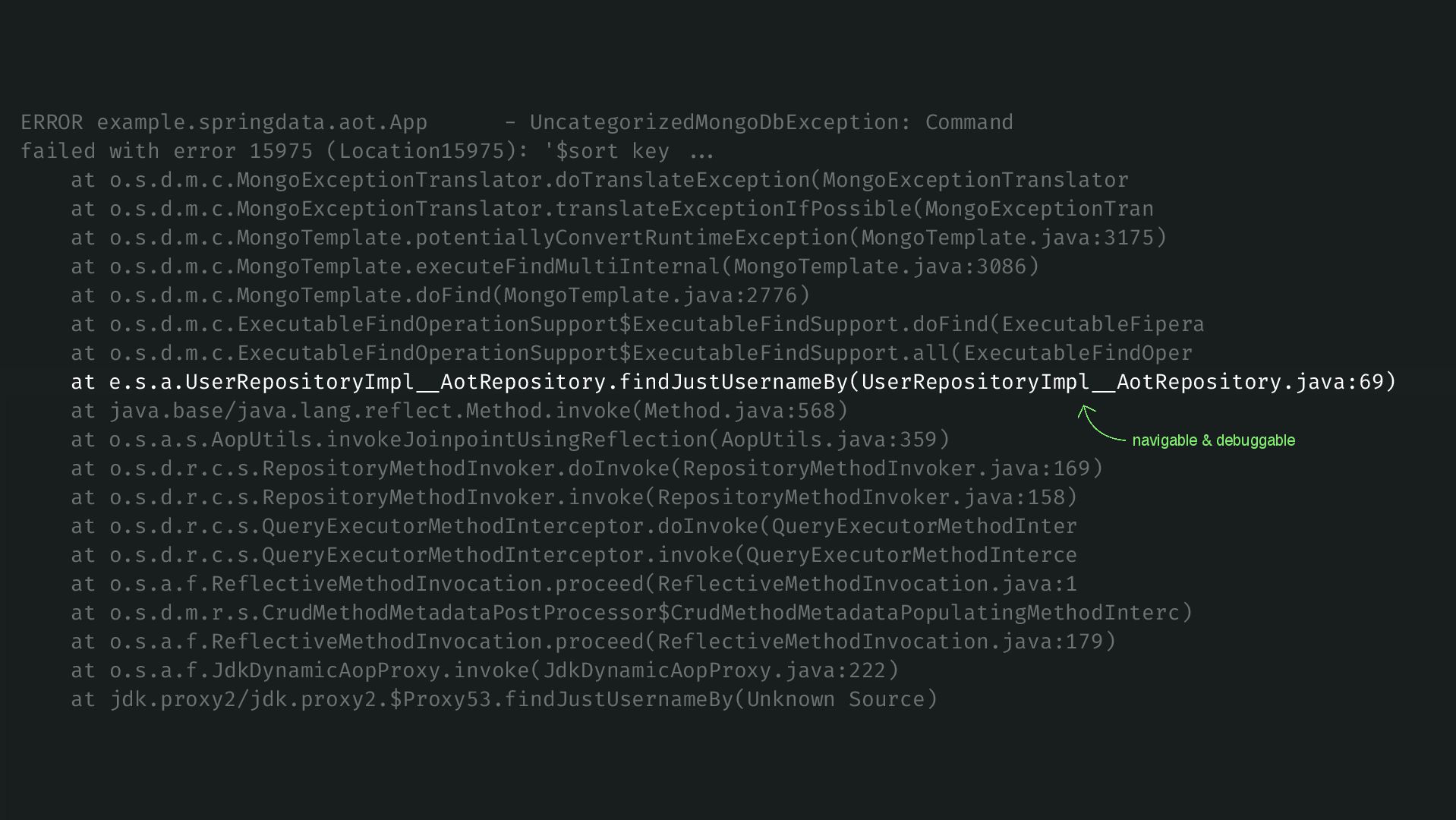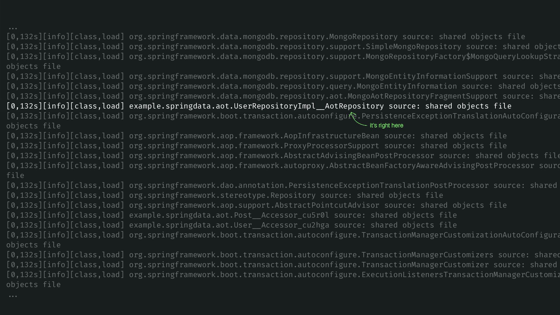 le [0,132s][info][class,load] org.springframework.data.mongodb.repository.support.SimpleMongoRepository source: shared object [0,132s][info][class,load] org.springframework.data.mongodb.repository.support.MongoRepositoryFactory$MongoQueryLookupStra objects f i le [0,132s][info][class,load] org.springframework.data.mongodb.repository.support.MongoEntityInformationSupport source: share [0,132s][info][class,load] org.springframework.data.mongodb.repository.query.MongoEntityInformation source: shared objects [0,132s][info][class,load] org.springframework.data.mongodb.repository.aot.MongoAotRepositoryFragmentSupport source: share [0,132s][info][class,load] example.springdata.aot.UserRepositoryImpl _ _ AotRepository source: shared objects f i le [0,132s][info][class,load] org.springframework.boot.transaction.autoconf i gure.PersistenceExceptionTranslationAutoConf i gura objects f i le [0,132s][info][class,load] org.springframework.aop.framework.AopInfrastructureBean source: shared objects f i le [0,132s][info][class,load] org.springframework.aop.framework.ProxyProcessorSupport source: shared objects f i le [0,132s][info][class,load] org.springframework.aop.framework.AbstractAdvisingBeanPostProcessor source: shared objects f i le [0,132s][info][class,load] org.springframework.aop.framework.autoproxy.AbstractBeanFactoryAwareAdvisingPostProcessor sourc f i le [0,132s][info][class,load] org.springframework.dao.annotation.PersistenceExceptionTranslationPostProcessor source: shared [0,132s][info][class,load] org.springframework.stereotype.Repository source: shared objects f i le [0,132s][info][class,load] org.springframework.aop.support.AbstractPointcutAdvisor source: shared objects f i le [0,132s][info][class,load] example.springdata.aot.Post _ _ Accessor_cu5r0l source: shared objects f i le [0,132s][info][class,load] example.springdata.aot.User _ _ Accessor_cu2hga source: shared objects f i le [0,132s][info][class,load] org.springframework.boot.transaction.autoconf i gure.TransactionManagerCustomizationAutoConf i gura objects f i le [0,132s][info][class,load] org.springframework.boot.transaction.autoconf i gure.TransactionManagerCustomizers source: shared [0,132s][info][class,load] org.springframework.boot.transaction.autoconf i gure.TransactionManagerCustomizer source: shared [0,132s][info][class,load] org.springframework.boot.transaction.autoconf i gure.ExecutionListenersTransactionManagerCustomiz objects f i le . . . it’s right here