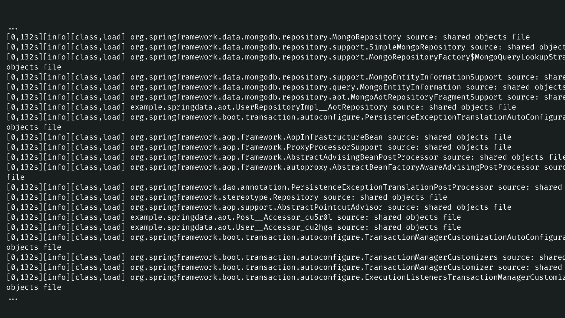 le [0,132s][info][class,load] org.springframework.data.mongodb.repository.support.SimpleMongoRepository source: shared object [0,132s][info][class,load] org.springframework.data.mongodb.repository.support.MongoRepositoryFactory$MongoQueryLookupStra objects f i le [0,132s][info][class,load] org.springframework.data.mongodb.repository.support.MongoEntityInformationSupport source: share [0,132s][info][class,load] org.springframework.data.mongodb.repository.query.MongoEntityInformation source: shared objects [0,132s][info][class,load] org.springframework.data.mongodb.repository.aot.MongoAotRepositoryFragmentSupport source: share [0,132s][info][class,load] example.springdata.aot.UserRepositoryImpl _ _ AotRepository source: shared objects f i le [0,132s][info][class,load] org.springframework.boot.transaction.autoconf i gure.PersistenceExceptionTranslationAutoConf i gura objects f i le [0,132s][info][class,load] org.springframework.aop.framework.AopInfrastructureBean source: shared objects f i le [0,132s][info][class,load] org.springframework.aop.framework.ProxyProcessorSupport source: shared objects f i le [0,132s][info][class,load] org.springframework.aop.framework.AbstractAdvisingBeanPostProcessor source: shared objects f i le [0,132s][info][class,load] org.springframework.aop.framework.autoproxy.AbstractBeanFactoryAwareAdvisingPostProcessor sourc f i le [0,132s][info][class,load] org.springframework.dao.annotation.PersistenceExceptionTranslationPostProcessor source: shared [0,132s][info][class,load] org.springframework.stereotype.Repository source: shared objects f i le [0,132s][info][class,load] org.springframework.aop.support.AbstractPointcutAdvisor source: shared objects f i le [0,132s][info][class,load] example.springdata.aot.Post _ _ Accessor_cu5r0l source: shared objects f i le [0,132s][info][class,load] example.springdata.aot.User _ _ Accessor_cu2hga source: shared objects f i le [0,132s][info][class,load] org.springframework.boot.transaction.autoconf i gure.TransactionManagerCustomizationAutoConf i gura objects f i le [0,132s][info][class,load] org.springframework.boot.transaction.autoconf i gure.TransactionManagerCustomizers source: shared [0,132s][info][class,load] org.springframework.boot.transaction.autoconf i gure.TransactionManagerCustomizer source: shared [0,132s][info][class,load] org.springframework.boot.transaction.autoconf i gure.ExecutionListenersTransactionManagerCustomiz objects f i le . . .