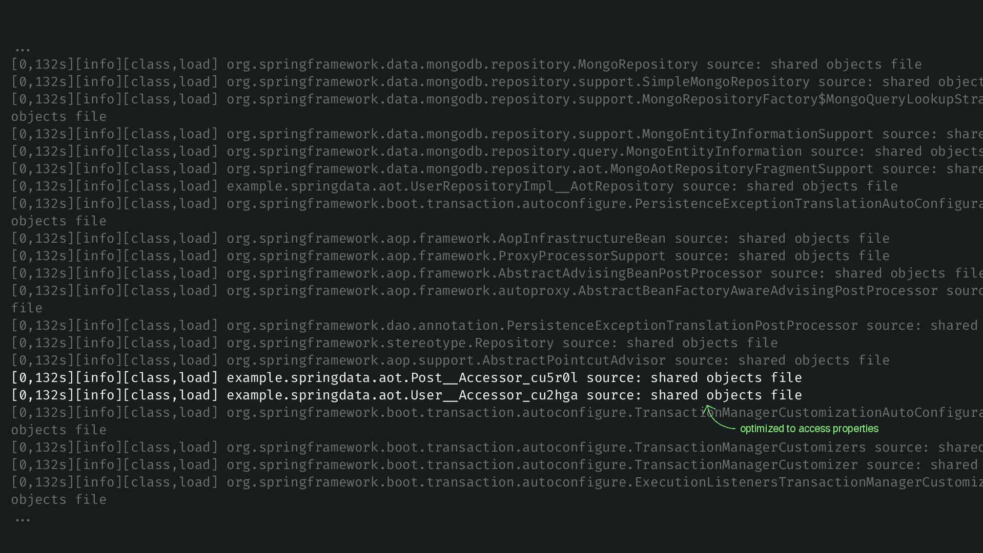 le [0,132s][info][class,load] org.springframework.data.mongodb.repository.support.SimpleMongoRepository source: shared object [0,132s][info][class,load] org.springframework.data.mongodb.repository.support.MongoRepositoryFactory$MongoQueryLookupStra objects f i le [0,132s][info][class,load] org.springframework.data.mongodb.repository.support.MongoEntityInformationSupport source: share [0,132s][info][class,load] org.springframework.data.mongodb.repository.query.MongoEntityInformation source: shared objects [0,132s][info][class,load] org.springframework.data.mongodb.repository.aot.MongoAotRepositoryFragmentSupport source: share [0,132s][info][class,load] example.springdata.aot.UserRepositoryImpl _ _ AotRepository source: shared objects f i le [0,132s][info][class,load] org.springframework.boot.transaction.autoconf i gure.PersistenceExceptionTranslationAutoConf i gura objects f i le [0,132s][info][class,load] org.springframework.aop.framework.AopInfrastructureBean source: shared objects f i le [0,132s][info][class,load] org.springframework.aop.framework.ProxyProcessorSupport source: shared objects f i le [0,132s][info][class,load] org.springframework.aop.framework.AbstractAdvisingBeanPostProcessor source: shared objects f i le [0,132s][info][class,load] org.springframework.aop.framework.autoproxy.AbstractBeanFactoryAwareAdvisingPostProcessor sourc f i le [0,132s][info][class,load] org.springframework.dao.annotation.PersistenceExceptionTranslationPostProcessor source: shared [0,132s][info][class,load] org.springframework.stereotype.Repository source: shared objects f i le [0,132s][info][class,load] org.springframework.aop.support.AbstractPointcutAdvisor source: shared objects f i le [0,132s][info][class,load] example.springdata.aot.Post _ _ Accessor_cu5r0l source: shared objects f i le [0,132s][info][class,load] example.springdata.aot.User _ _ Accessor_cu2hga source: shared objects f i le [0,132s][info][class,load] org.springframework.boot.transaction.autoconf i gure.TransactionManagerCustomizationAutoConf i gura objects f i le [0,132s][info][class,load] org.springframework.boot.transaction.autoconf i gure.TransactionManagerCustomizers source: shared [0,132s][info][class,load] org.springframework.boot.transaction.autoconf i gure.TransactionManagerCustomizer source: shared [0,132s][info][class,load] org.springframework.boot.transaction.autoconf i gure.ExecutionListenersTransactionManagerCustomiz objects f i le . . . optimized to access properties
