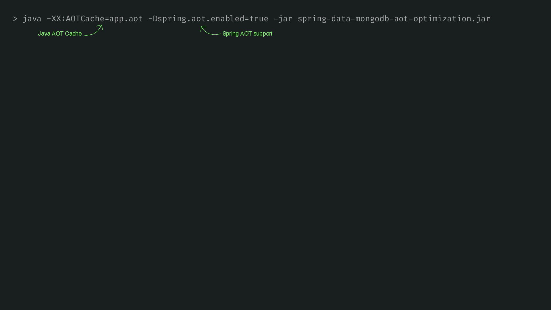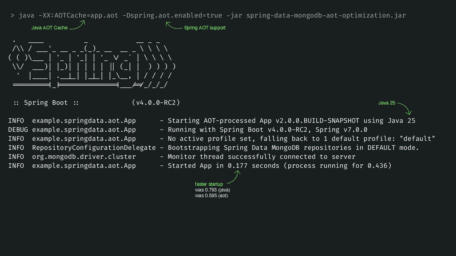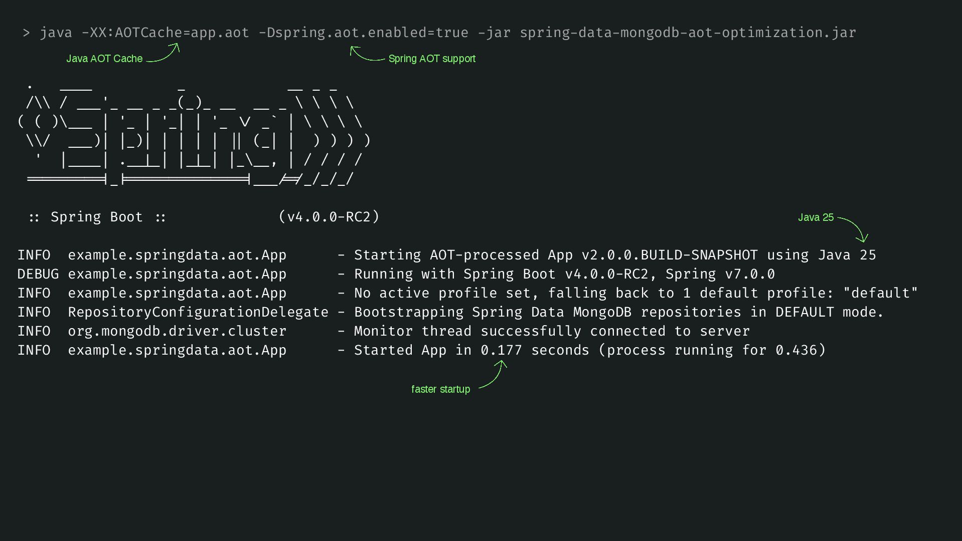 Java 25 > java -XX : AOTCache=app.aot -Dspring.aot.enabled=true - jar spring - data - mongodb - aot - optimization.jar Java AOT Cache Spring AOT support