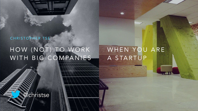 I have worked in startups and in big companies at various stages of my career thus far. I see a lot of startups approach big companies to sell their wares, ask for partnerships, bid for contracts, look for investments, and seek to be acquired. The successful ones shared a few things in common in language, tactics, and goals. This talk strings to gather a series of analogies, involving a game of Jenga, a messy IT closet, motorized Legos, two planets, a space probe, and a locked gold vault to shed some light on nature of the often uneasy, and sometimes mutually beneficial, relationships between newcomers and incumbents.