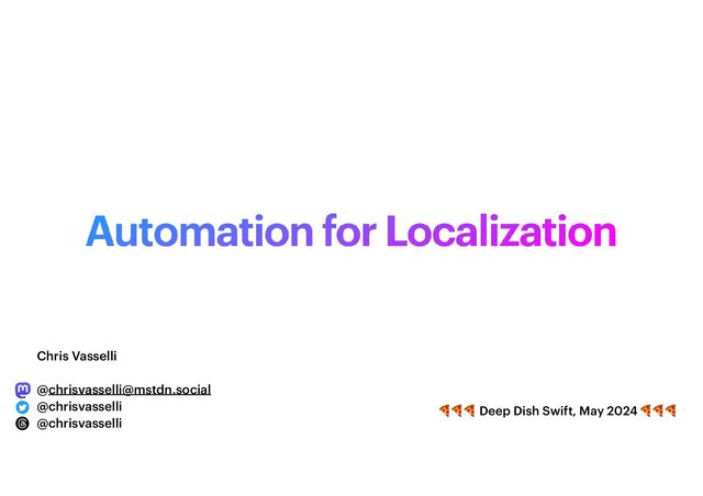 In this talk, I’ll discuss what aspects of localization I entrust to professional translators, what I use machine translation for, and what I use crowdsourcing from social media for. I’ll discuss techniques for automating various aspects of the localization process, including (1) generating screenshots of strings for providing context to translators and validating their translations, (2) generating app store screenshots, including marketing copy in multiple languages, (3) generating meaningful release notes in multiple languages, and (4) verifying app layout and correctness in multiple languages.