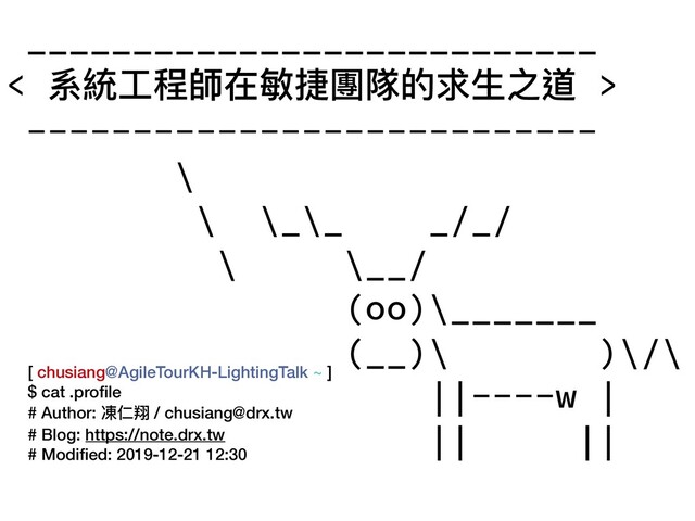 在敏捷團隊 (Agile team) 生活 2 年多的凍仁,在高雄敏捷之旅 2019 (#AgileTourKaohsiung) 的閃電秀中,分享些工作上的小技巧。