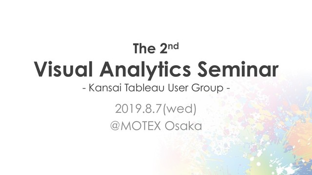 2019年8月7日に大阪で開催した第2回 Visual Analyticsセミナー - 関西Tableauユーザー会の時の資料です。本イベントは関西Tableauユーザ会の活動の一環として開催しました。イベントページは以下。