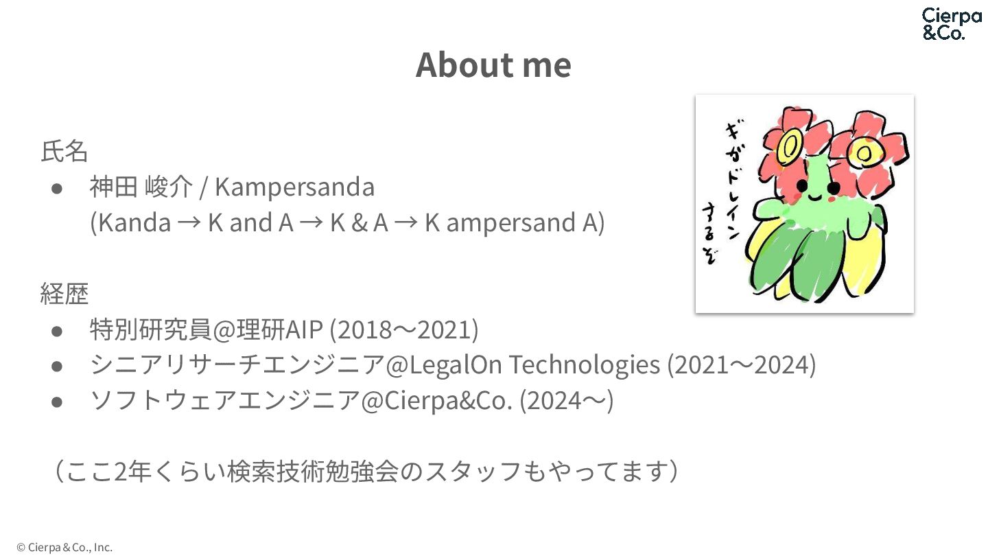 → K and A → K & A → K ampersand A) 経歴 • 特別研究員@理研AIP (2018〜2021) • シニアリサーチエンジニア@LegalOn Technologies (2021〜2024) • ソフトウェアエンジニア@Cierpa&Co. (2024〜) (ここ2年くらい検索技術勉強会のスタッフもやってます) About me
