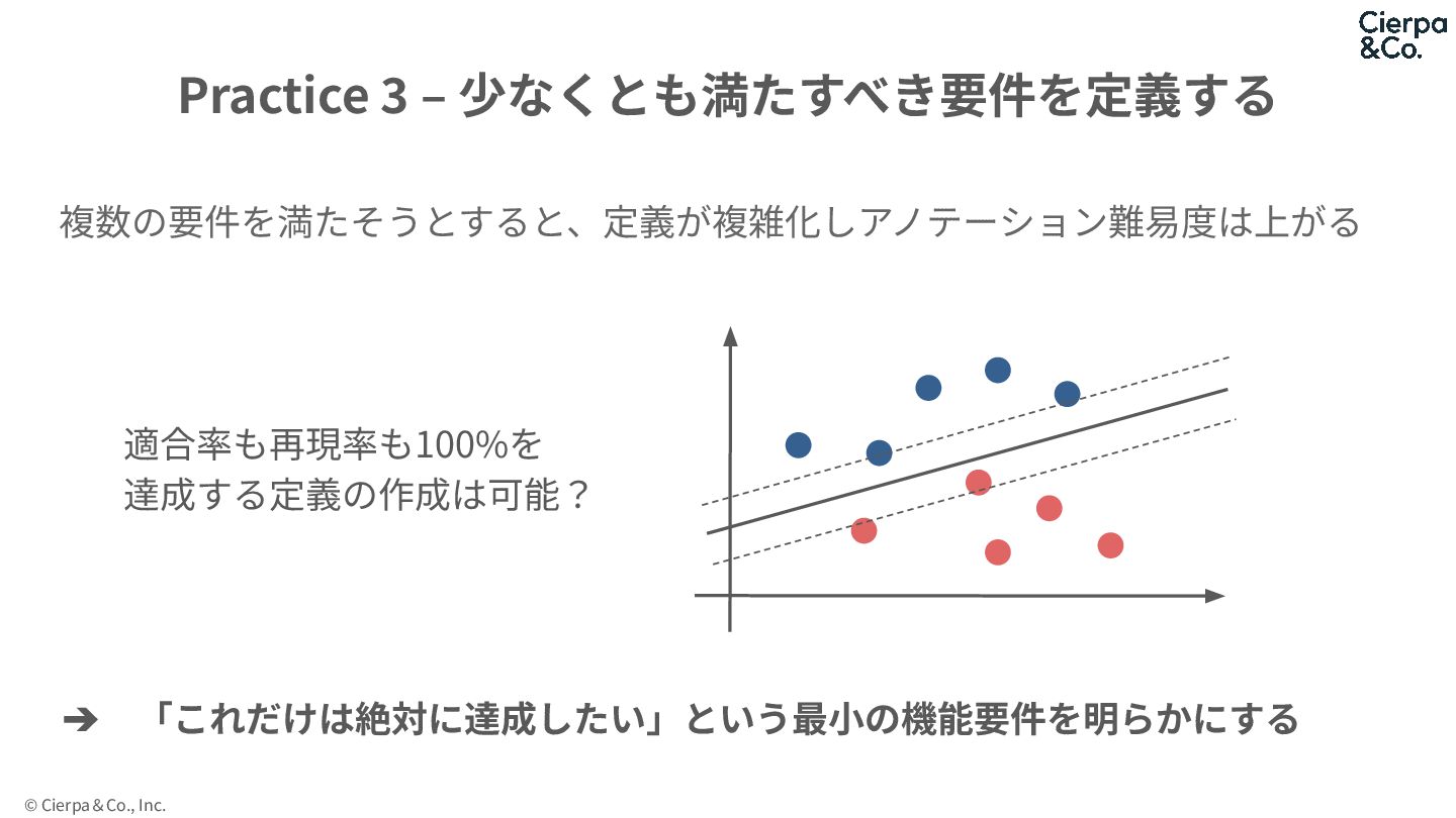 © Cierpa&Co., Inc. 複数の要件を満たそうとすると、定義が複雑化しアノテーション難易度は上がる Practice 3 ‒ 少なくとも満たすべき要件を定義する 適合率も再現率も100%を 達成する定義の作成は可能?