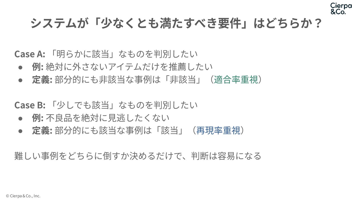定義: 部分的にも⾮該当な事例は「⾮該当」(適合率重視) Case B: 「少しでも該当」なものを判別したい • 例: 不良品を絶対に⾒逃したくない • 定義: 部分的にも該当な事例は「該当」(再現率重視) 難しい事例をどちらに倒すか決めるだけで、判断は容易になる システムが「少なくとも満たすべき要件」はどちらか?