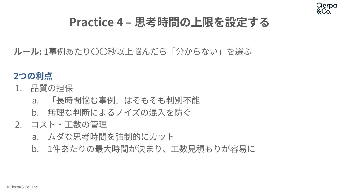 © Cierpa&Co., Inc. ルール: 1事例あたり〇〇秒以上悩んだら「分からない」を選ぶ 2つの利点 1. 品質の担保 a. 「⻑時間悩む事例」はそもそも判別不能