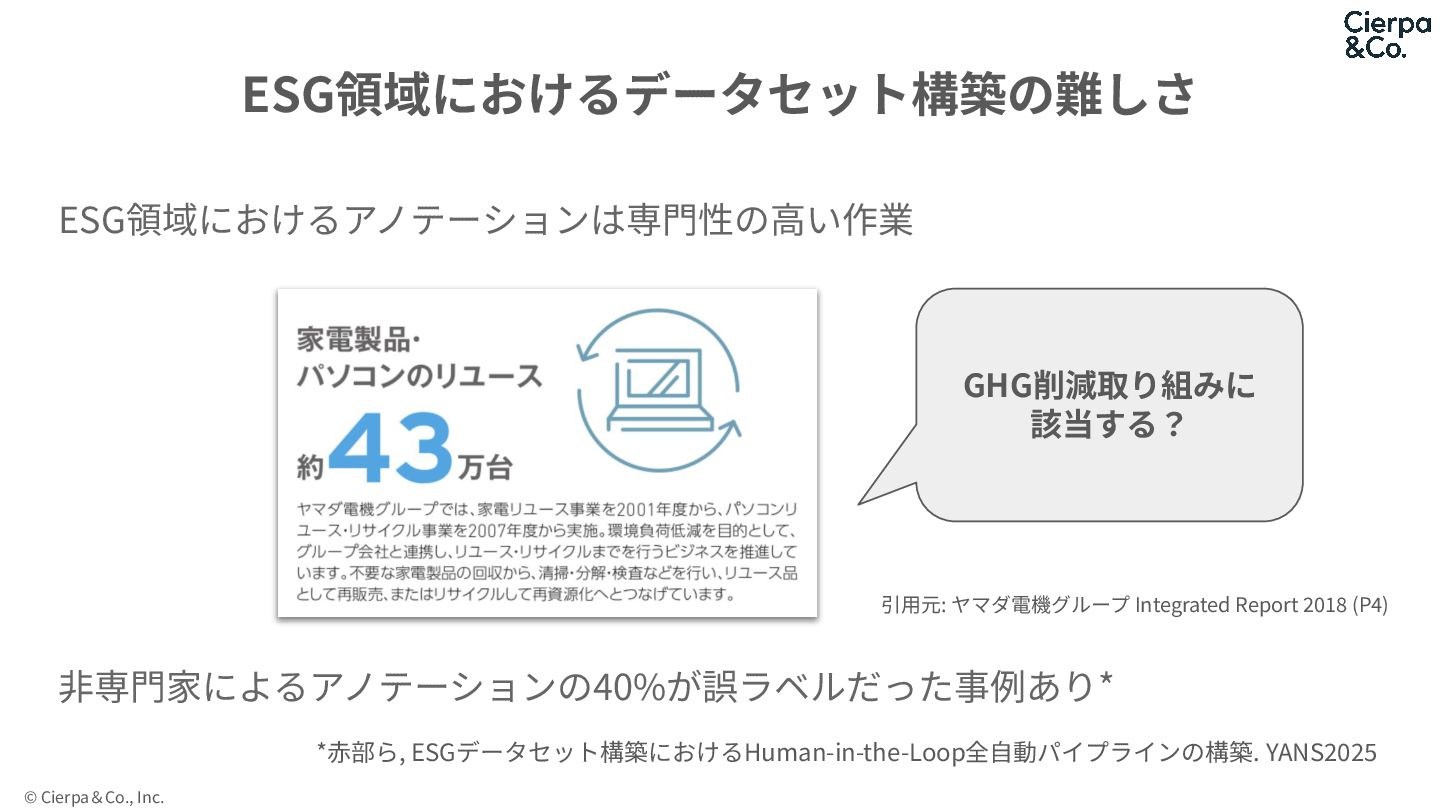 © Cierpa&Co., Inc. ESG領域におけるアノテーションは専⾨性の⾼い作業 ⾮専⾨家によるアノテーションの40%が誤ラベルだった事例あり* ESG領域におけるデータセット構築の難しさ GHG削減取り組みに 該当する? *⾚部ら, ESGデータセット構築におけるHuman-in-the-Loop全⾃動パイプラインの構築.