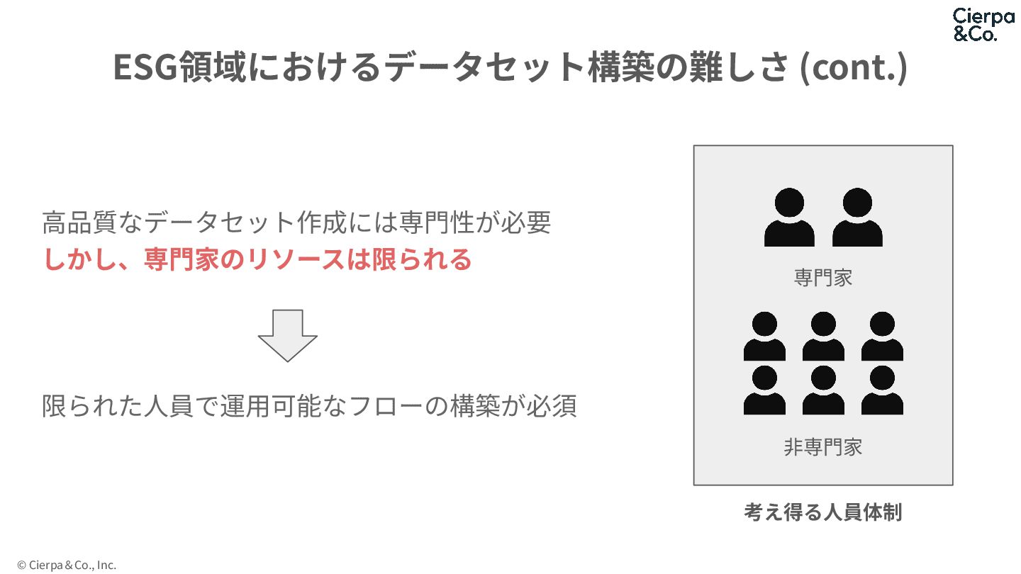 © Cierpa&Co., Inc. ⾼品質なデータセット作成には専⾨性が必要 しかし、専⾨家のリソースは限られる 限られた⼈員で運⽤可能なフローの構築が必須 ESG領域におけるデータセット構築の難しさ (cont.) 専⾨家 ⾮専⾨家
