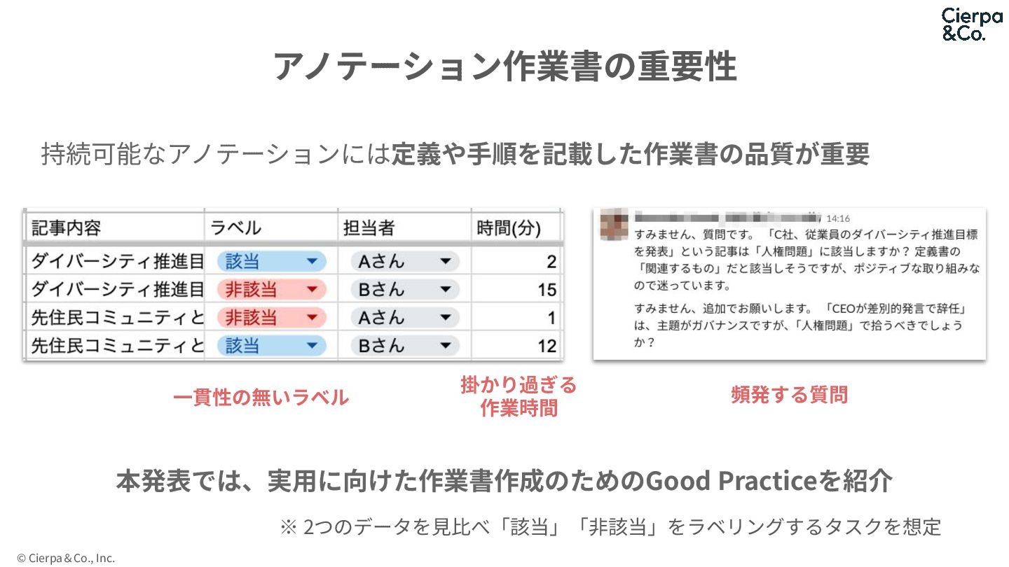 © Cierpa&Co., Inc. 持続可能なアノテーションには定義や⼿順を記載した作業書の品質が重要 本発表では、実⽤に向けた作業書作成のためのGood Practiceを紹介 アノテーション作業書の重要性 ⼀貫性の無いラベル 頻発する質問 掛かり過ぎる