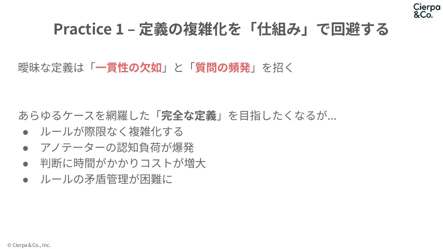 © Cierpa&Co., Inc. 曖昧な定義は「⼀貫性の⽋如」と「質問の頻発」を招く あらゆるケースを網羅した「完全な定義」を⽬指したくなるが... • ルールが際限なく複雑化する • アノテーターの認知負荷が爆発 •