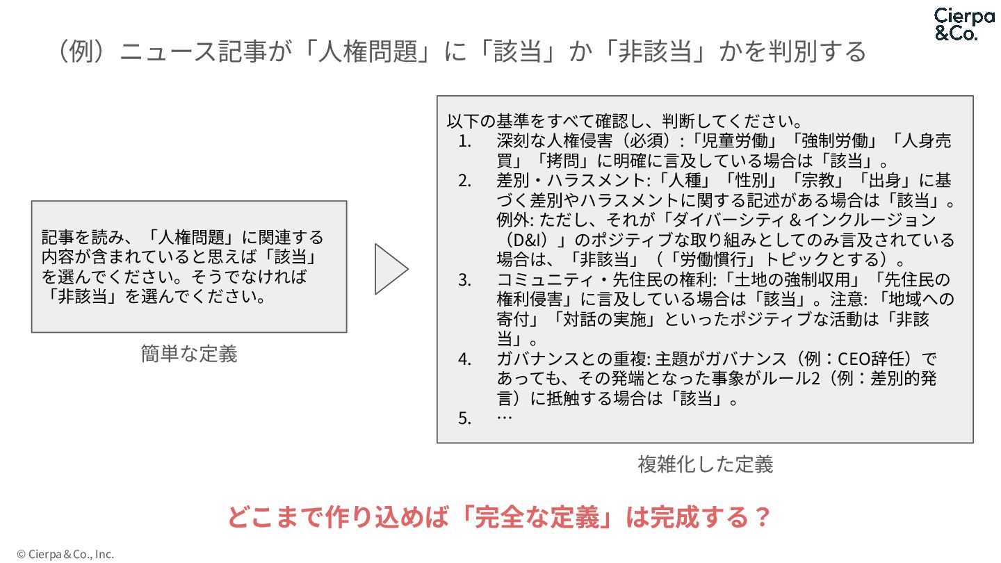 深刻な⼈権侵害(必須):「児童労働」「強制労働」「⼈⾝売 買」「拷問」に明確に⾔及している場合は「該当」。 2. 差別‧ハラスメント:「⼈種」「性別」「宗教」「出⾝」に基 づく差別やハラスメントに関する記述がある場合は「該当」。 例外: ただし、それが「ダイバーシティ&インクルージョン (D&I)」のポジティブな取り組みとしてのみ⾔及されている 場合は、「⾮該当」(「労働慣⾏」トピックとする)。 3. コミュニティ‧先住⺠の権利:「⼟地の強制収⽤」「先住⺠の 権利侵害」に⾔及している場合は「該当」。注意: 「地域への 寄付」「対話の実施」といったポジティブな活動は「⾮該 当」。 4. ガバナンスとの重複: 主題がガバナンス(例:CEO辞任)で あっても、その発端となった事象がルール2(例:差別的発 ⾔)に抵触する場合は「該当」。 5. … 複雑化した定義 (例)ニュース記事が「⼈権問題」に「該当」か「⾮該当」かを判別する どこまで作り込めば「完全な定義」は完成する?