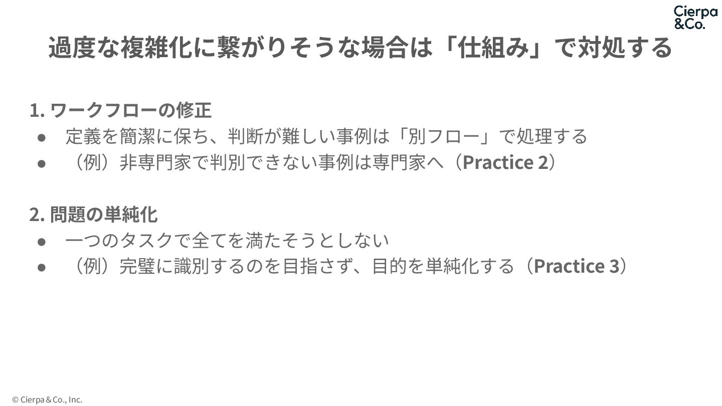 © Cierpa&Co., Inc. 1. ワークフローの修正 • 定義を簡潔に保ち、判断が難しい事例は「別フロー」で処理する • (例)⾮専⾨家で判別できない事例は専⾨家へ(Practice 2)