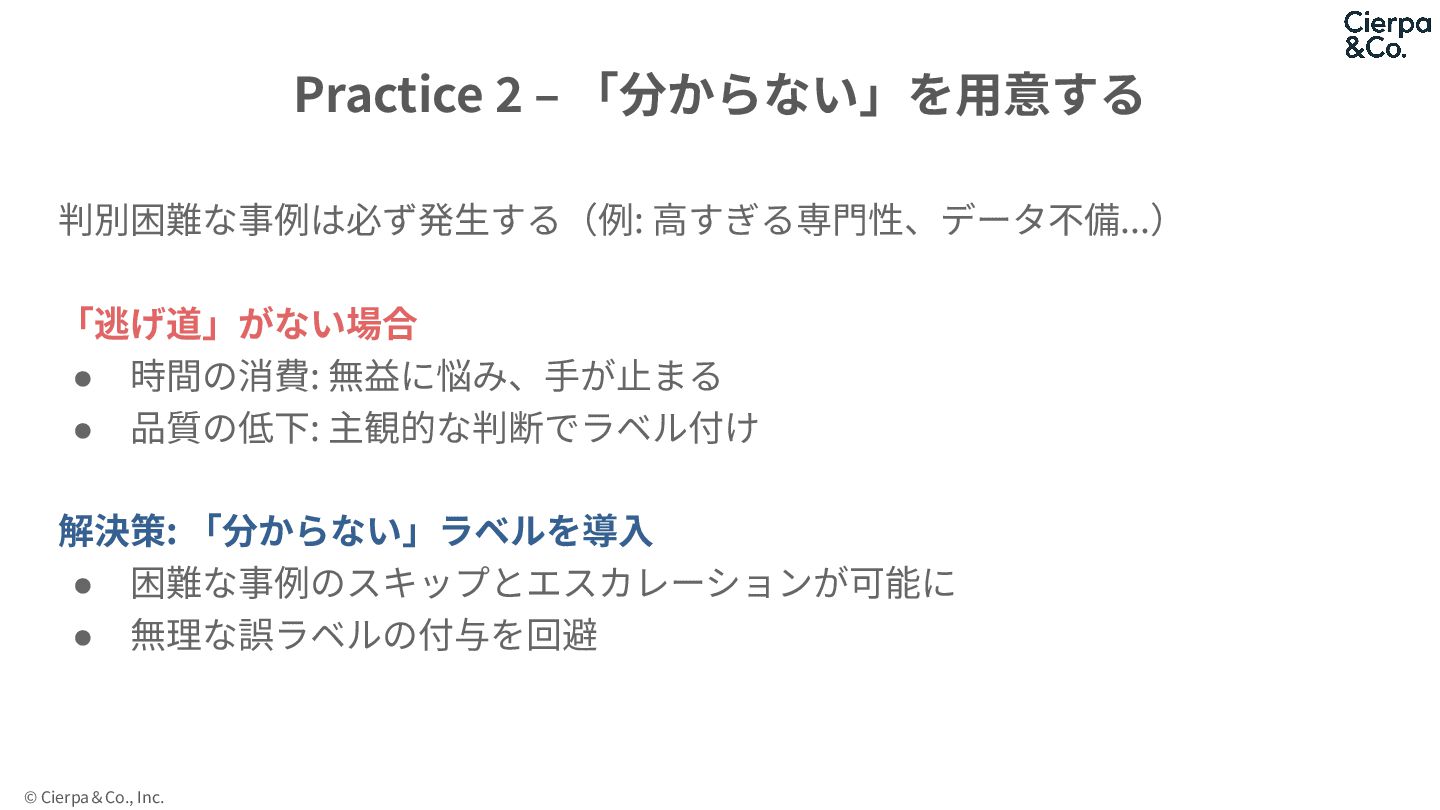 品質の低下: 主観的な判断でラベル付け 解決策: 「分からない」ラベルを導⼊ • 困難な事例のスキップとエスカレーションが可能に • 無理な誤ラベルの付与を回避 Practice 2 ‒ 「分からない」を⽤意する