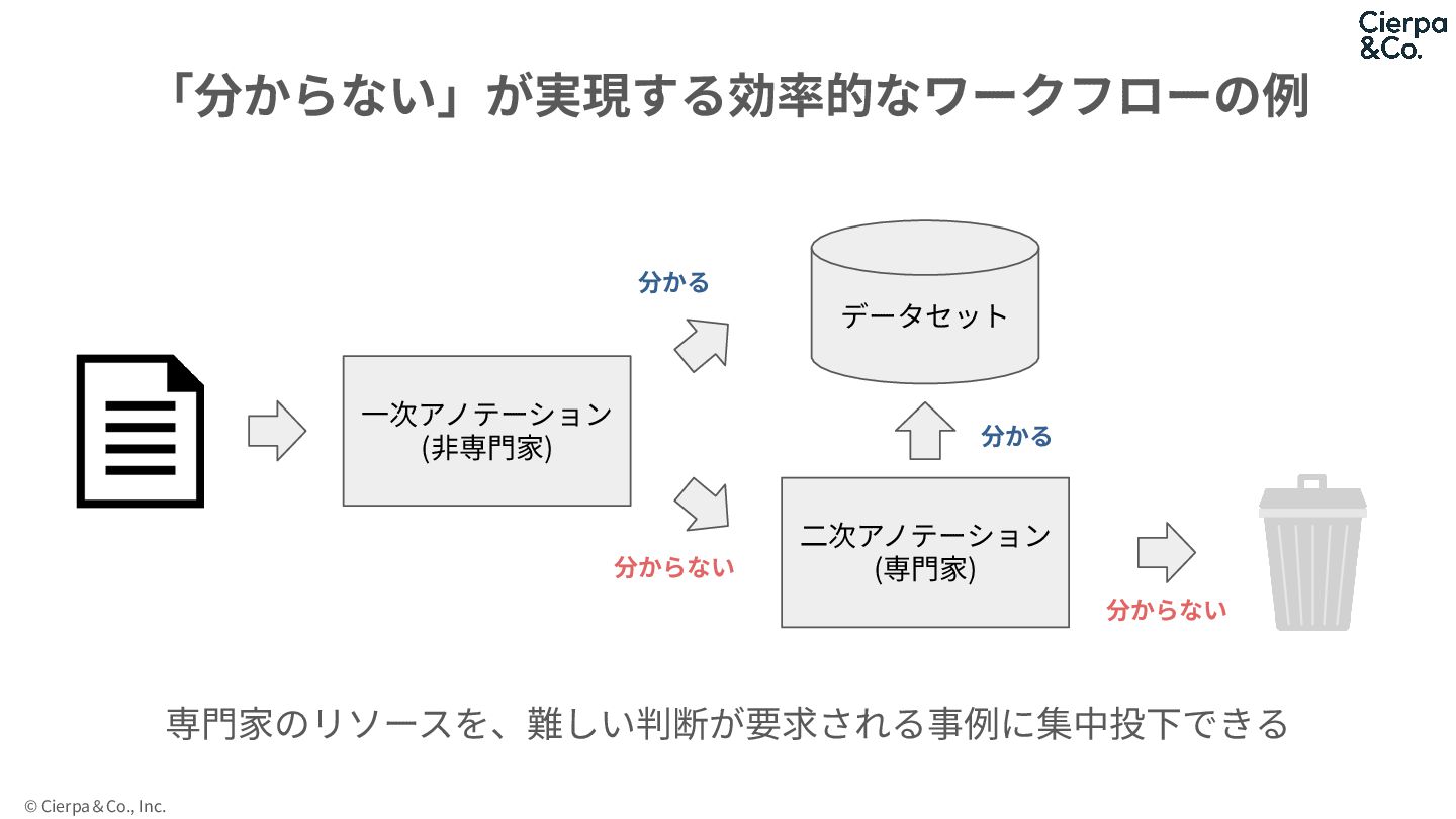 © Cierpa&Co., Inc. 「分からない」が実現する効率的なワークフローの例 ⼀次アノテーション (⾮専⾨家) データセット ⼆次アノテーション (専⾨家) 分からない