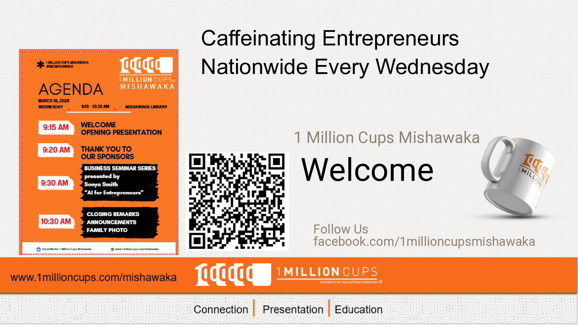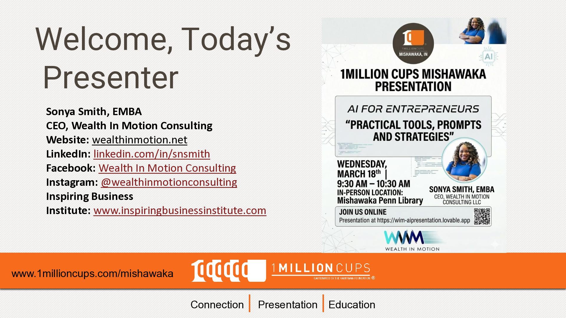 Educating, Inspiring and Connecting Entrepreneurs Nationwide Every Wednesday Morning at the Mishawaka Penn Harris Library, Lower Level, Eisen Room, Downtown Mishawaka. Arrive 9:00 am presentations begin at 9:15 am - 10:30 am.
