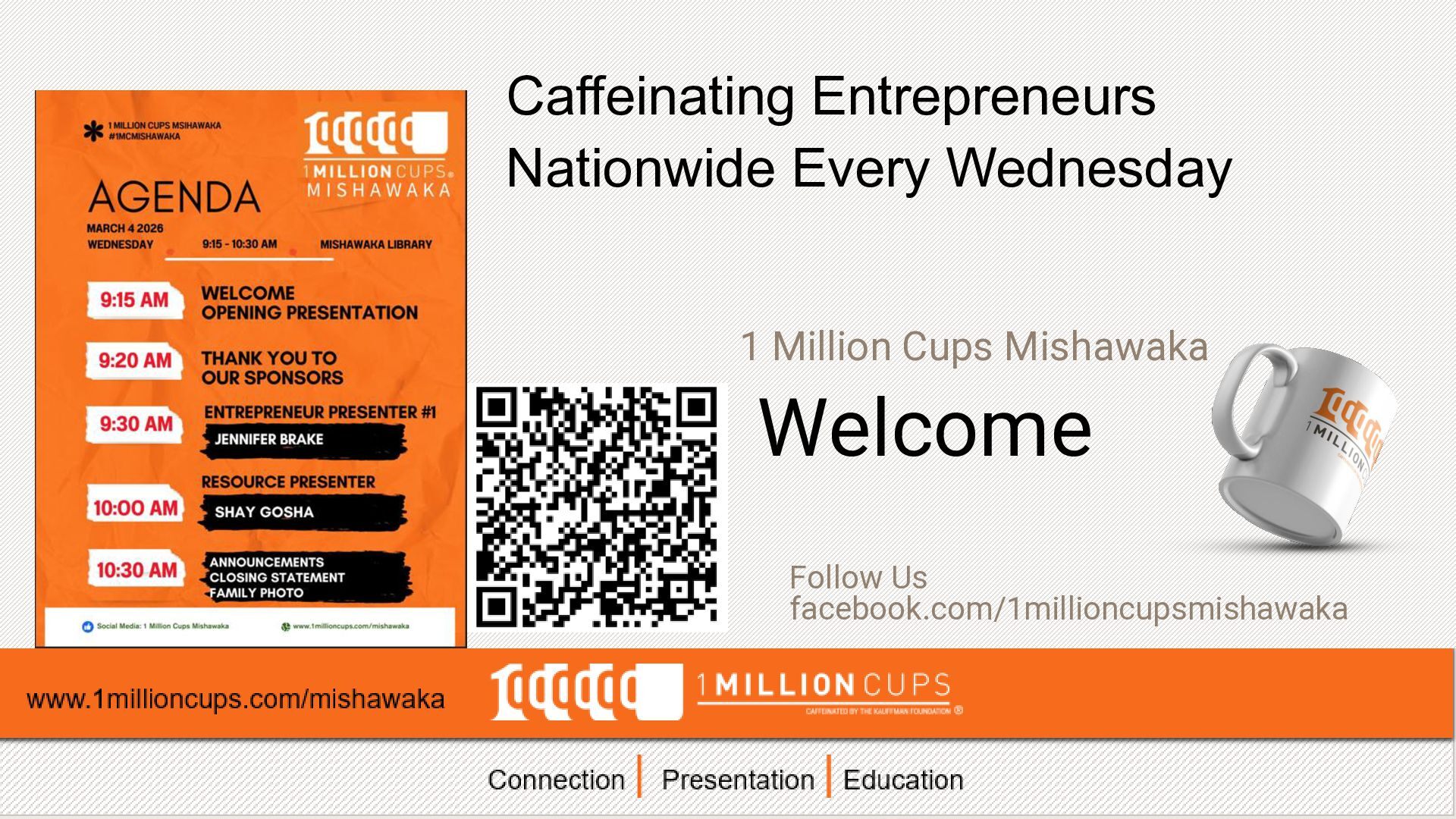 1. 1 Million Cups Mishawaka Welcome Follow Us facebook.com/1millioncupsmishawaka Connection |
